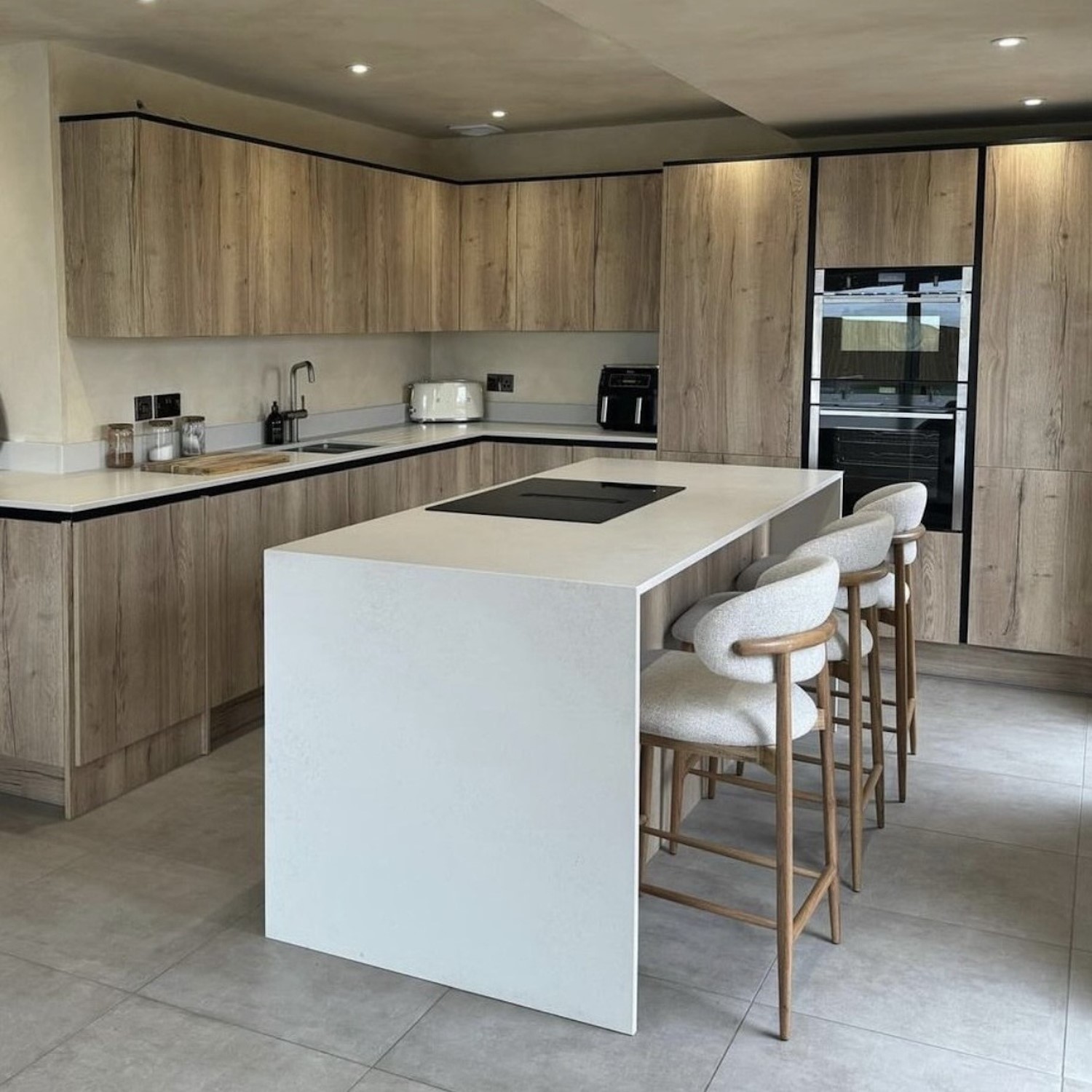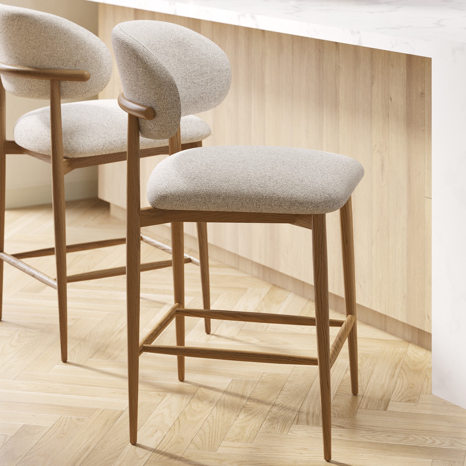 Upholstered in a beige textured fabric, the Kori kitchen stool is the perfect neutral addition to your kitchen space and is easy to style with different kitchen furniture. The exposed oak back detail adds a modern, stylish touch. Designed to look and feel good, the foam filled seat and curved back rest provide the ultimate comfort. Complete with a solid oak frame, this stool is built to last.