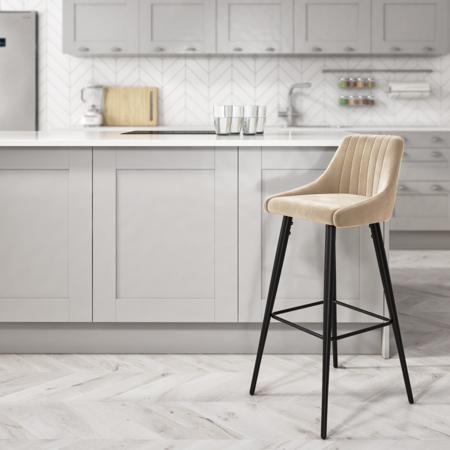 Whether you're looking for a stool for your home bar or breakfast bar, the Macie bar stool is the ideal addition for your space. Finished in a gorgeous, soft velvet with pleated backrest, this stool is as comfortable as it is good looking. Modern black legs and footrest round off this great looking piece perfectly.