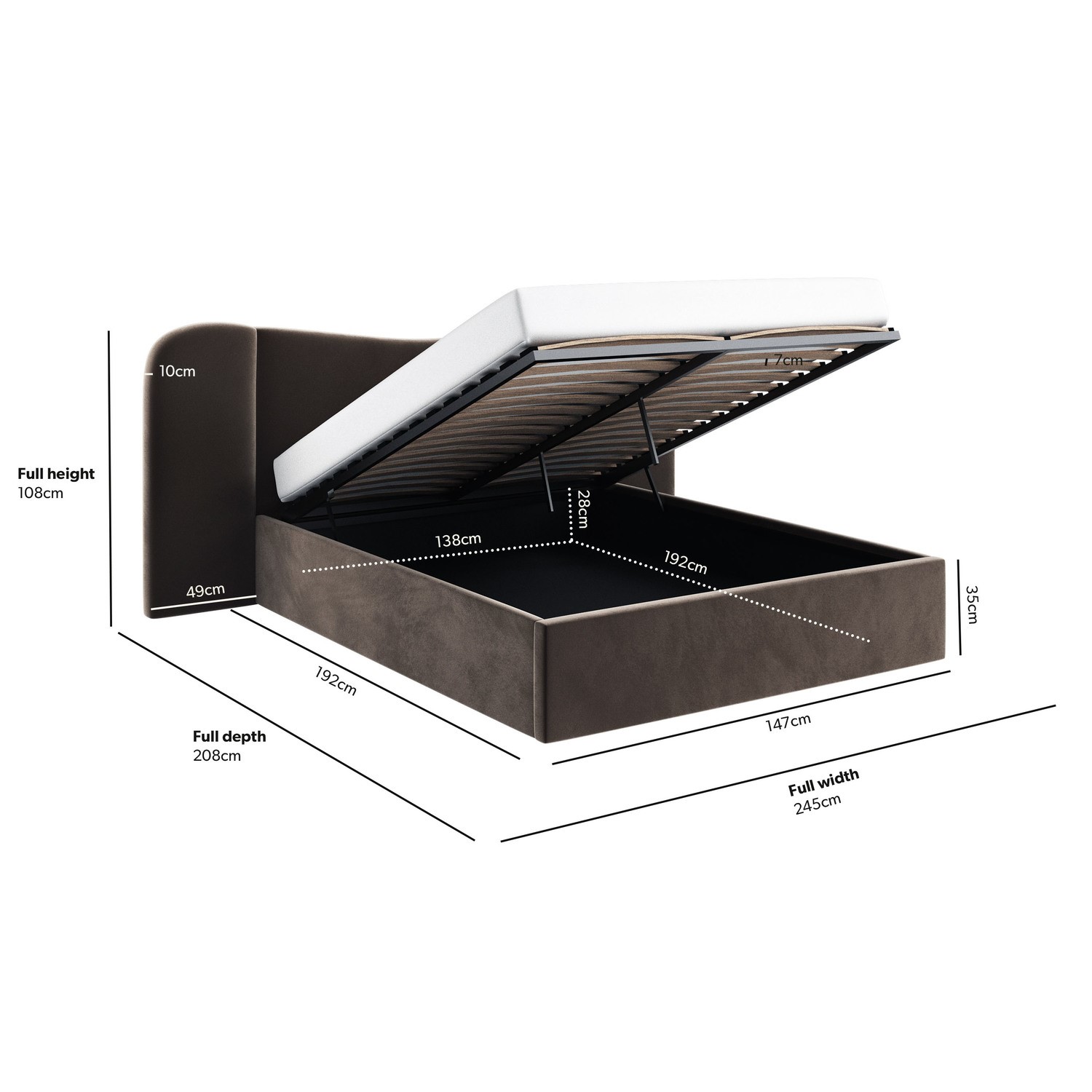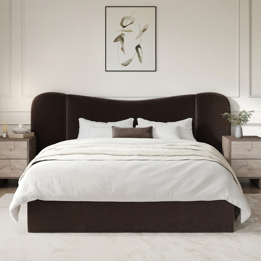The Samara Ottoman Bed is a stylish blend of contemporary design and functionality. Upholstered in sumptuous, soft-touch rich brown velvet fabric, Samara exudes a luxury hotel- style bed with a plush, curved, wide headboard that not only adds a touch of sophistication to any bedroom but also provides added comfort for sitting or lounging in bed. The end-opening gas-lift mechanism allows you to access the generous fabric-lined storage space effortlessly. It features a sprung slatted base for comfortable mattress support, ensuring a great night's sleep. This bed fits a UK standard double-size mattress.