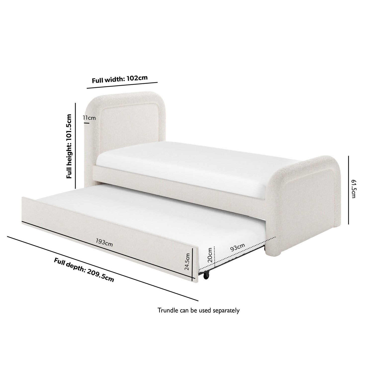 Enhance your bedroom with the Naomi single guest bed with trundle. Upholstered in a textured cream boucle fabric, it features a plush curved headboard which blends comfort with style. This bed also offers a space-saving solution as the discreet pull-out trundle is perfect for a smaller room or an additional sleeping space.The trundle easily glides out as it's fitted with castor wheel and can be set up to open from the side that works best for your room. Both beds have wooden sprung-slatted bases for comfortable mattress support and fit a standard UK single mattress.