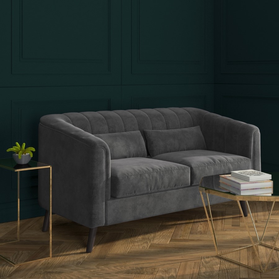 Add a sophisticated touch to your living area with this elegantly crafted two-seater sofa. Beautifully upholstered in a soft touch gunmetal grey velvet fabric, it's guaranteed to make an impact. It's further enhanced by its subtle chesterfield style roll top arms and elegant fluted back, giving it an extra luxurious look. For added comfort, it comes accompanied with two plump cushions to match the deep seats. The dark, angled wood legs add a lovely finishing touch.