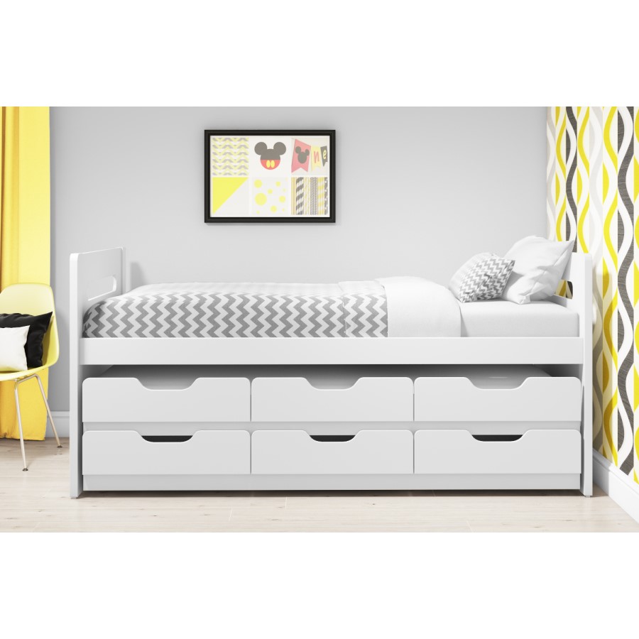 This versatile and practical single bed is the perfect space-saving solution for those last minute sleepovers or impromptu guests. That's because hidden beneath the stylish bed frame lies a second single mattress that slides out when you need it and slides back when you don't. The trundle bed sits discreetly behind three storage drawers and three dummy drawers which cleverly act as handles for quick and easy access to the bed, whilst maintaining a neat exterior. The three storage drawers are great for keeping your extra bedding and pillows, but within easy reach when required.