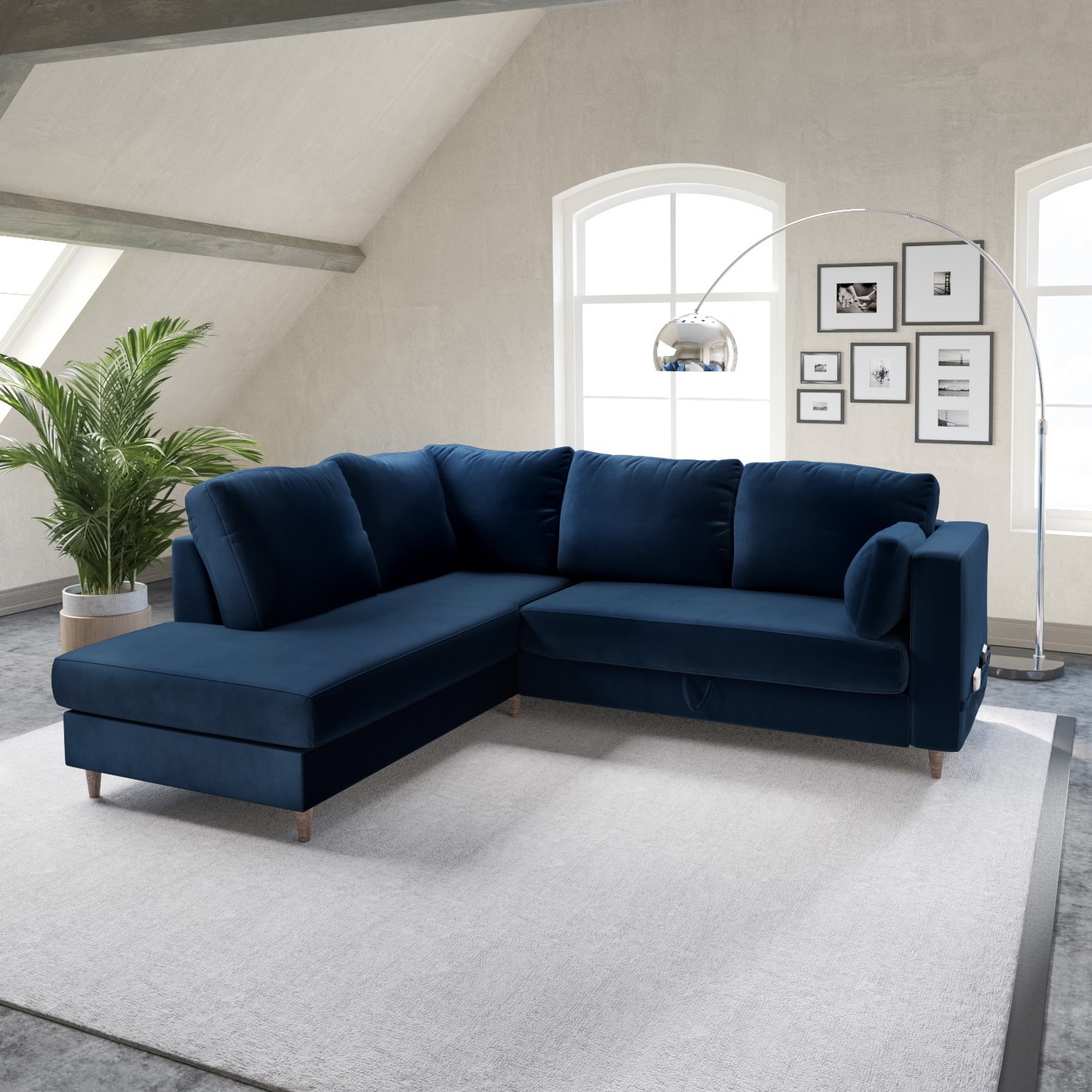 - Navy velvet left hand corner sofa bed with ottoman storage