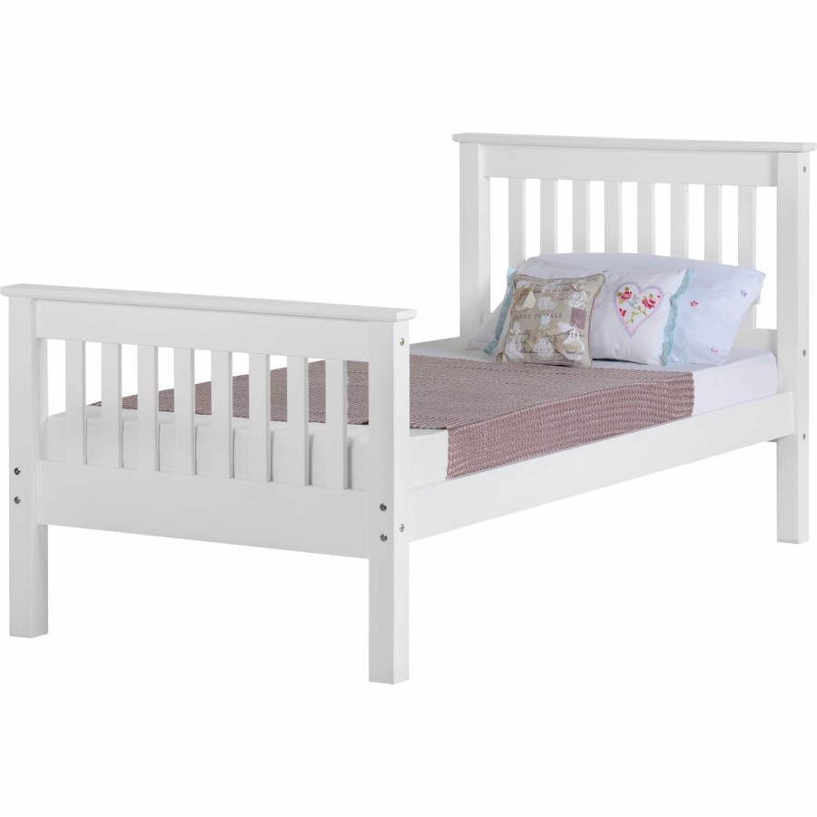 Monaco 3' Bed High Foot End in White. The Monaco Bed is a beautiful and elegant bed frame that will add to the ambiance of any bedroom décor. This luxurious bed includes a beautifully crafted headboard and a classic high foot end. With its sturdy, sleek design this bed is sure to create a graceful look to your room as well as provide an excellent night of sleep.