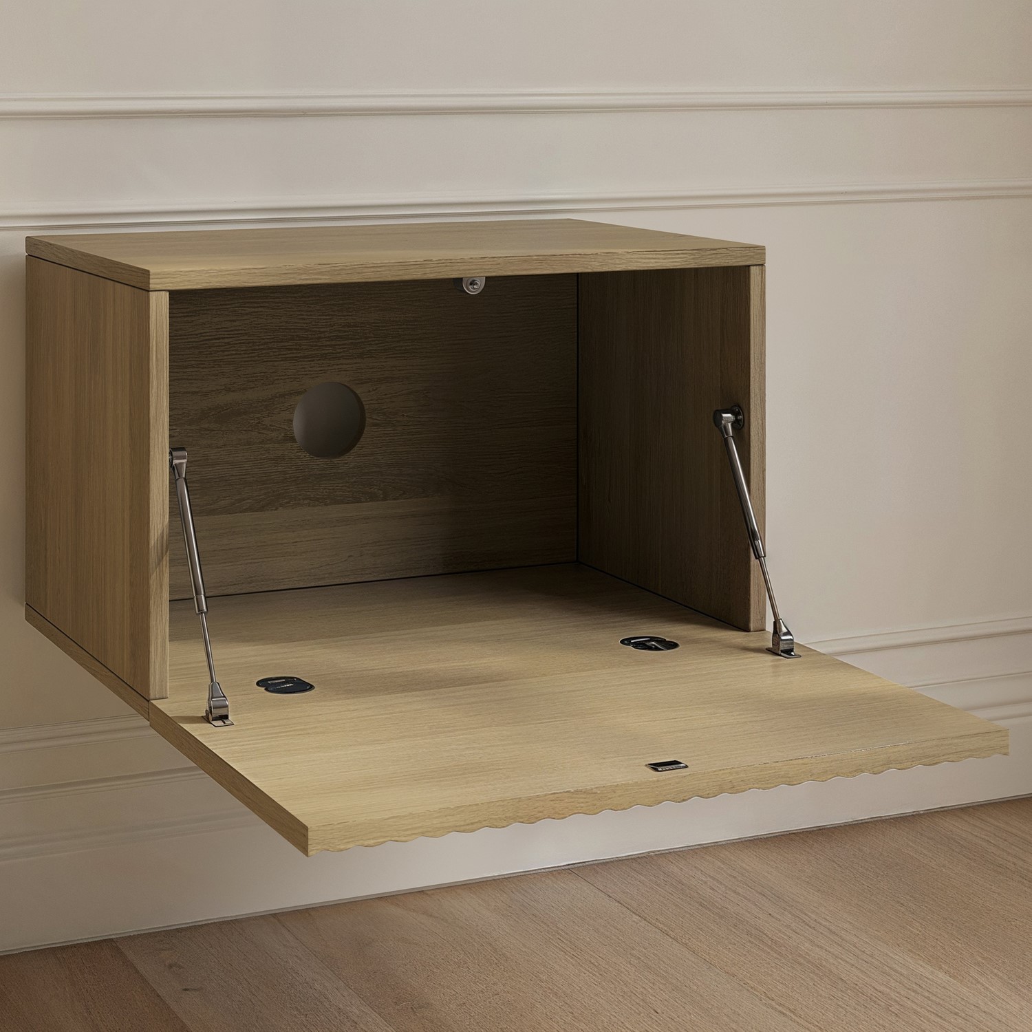 Designed for modern and minimalist spaces, this fluted front oak bedside table blends style with functionality. The wall-mounted structure keeps your floor space open while the drop-down soft-close door provides easy access to storage. A concealed cable management hole ensures your devices stay charged without messy wires. The natural oak finish makes it a must have for contemporary homes, this bedside table is both durable and timeless.