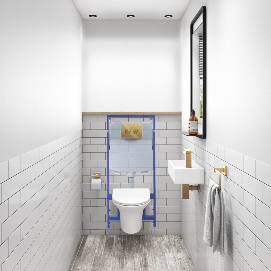 - Universal wall hung frame including a square Brushed Brass flush plate