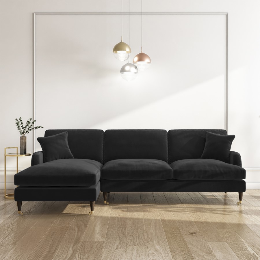 Upholstered in black velvet the Payton 3-seater sofa is the ultimate statement piece for any living room. With an added bonus of the chaise section, this sofa provides ample space to chill out and relax on an evening. Saddle arms with tailored piping make this piece sure to attract your guest’s attention. Dark wooden legs finished with gold castors at the front complete the sofa.