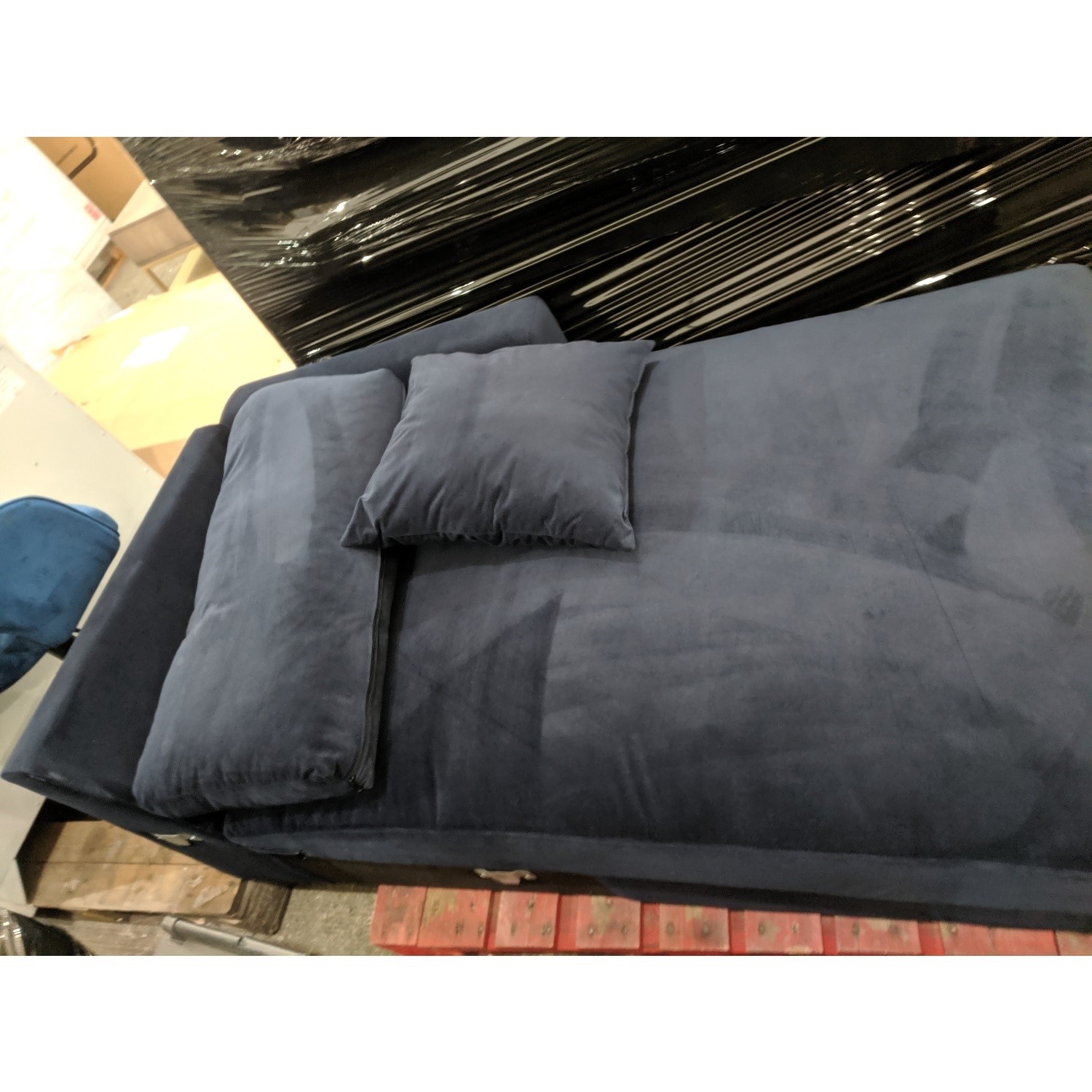 - Luxuriously soft navy blue velvet L-shaped sofa