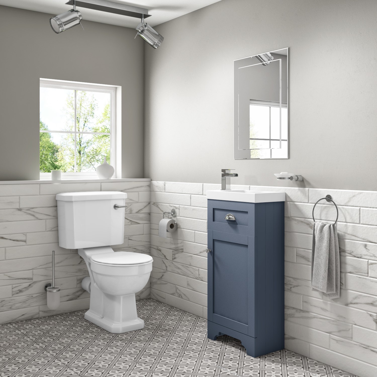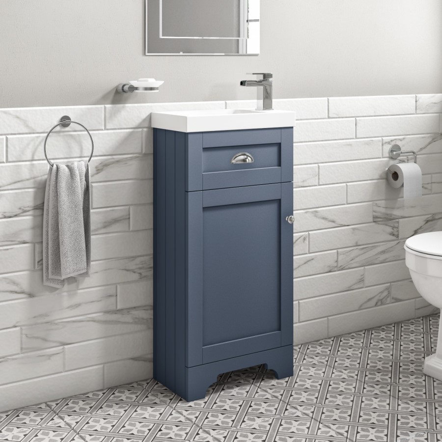 Enhance your bathroom with this Baxenden floor standing vanity basin unit. Characterised by a classic tongue-and-groove side panelling, cup style handles, an ornate front skirting and a matt blue finish, it has that traditional meets modern styling that'll look great in any style of bathroom.