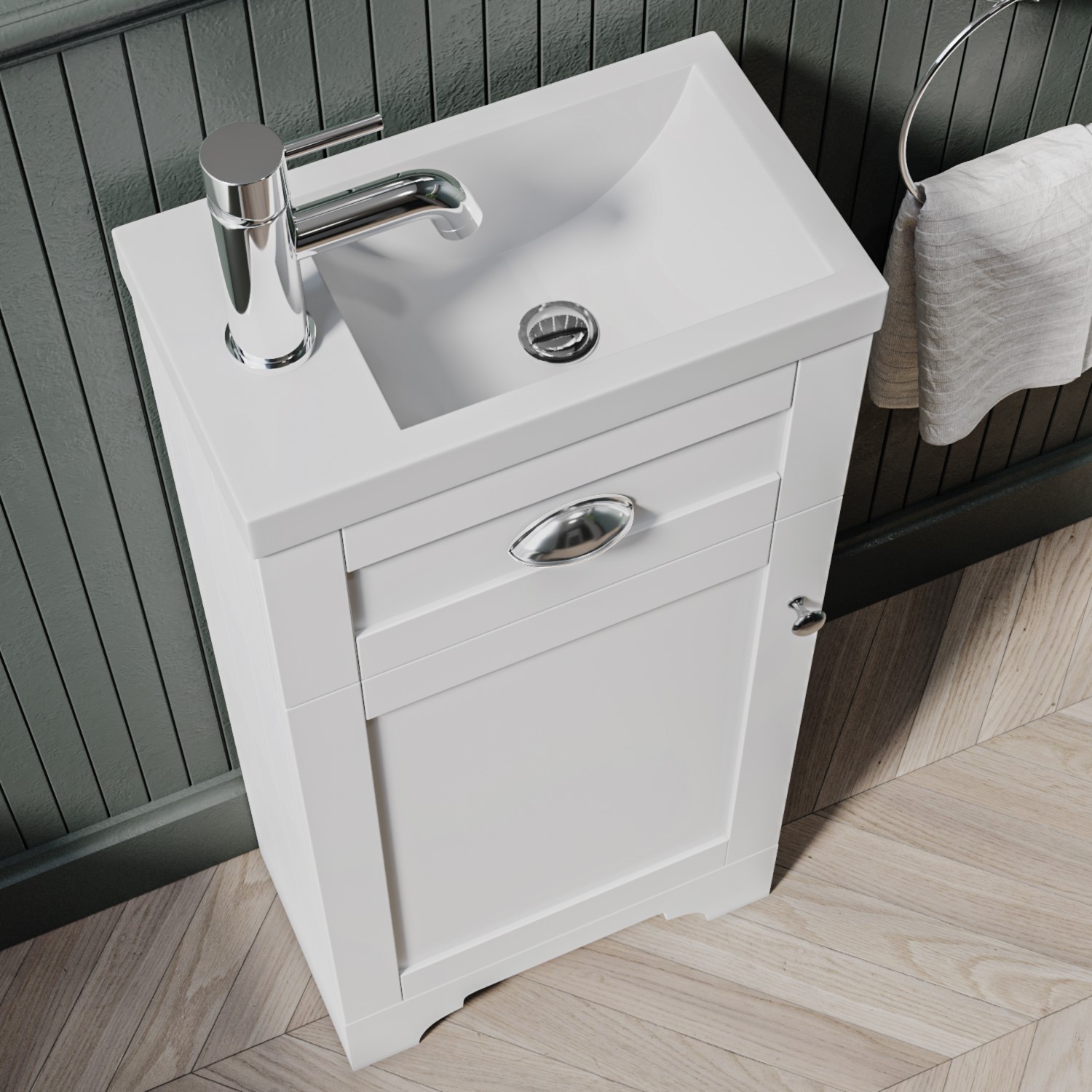 Enhance your bathroom with this Baxenden floor standing vanity basin unit. Characterised by a classic tongue-and-groove side panelling, cup style handles, an ornate front skirting and a matt white finish, it has that traditional meets modern styling that’ll look great in any style of bathroom.
