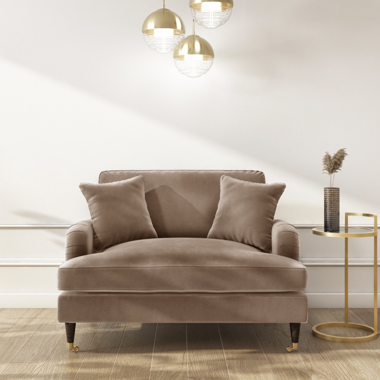 Discover maximum comfort and minimum maintenance with this gorgeous love seat. This plush Payton love seat offers traditional styling with a modern twist thanks to its dark wooden legs with gold accent front castors and classic ruched saddle arms. Beautifully tailored and upholstered in a warm beige, it brings a splash of natural warmth to your living space, making it the perfect statement piece. It comfortably seats 1 with space for 2 and comes accompanied with two matching throw cushions which add a final flourish of elegance.