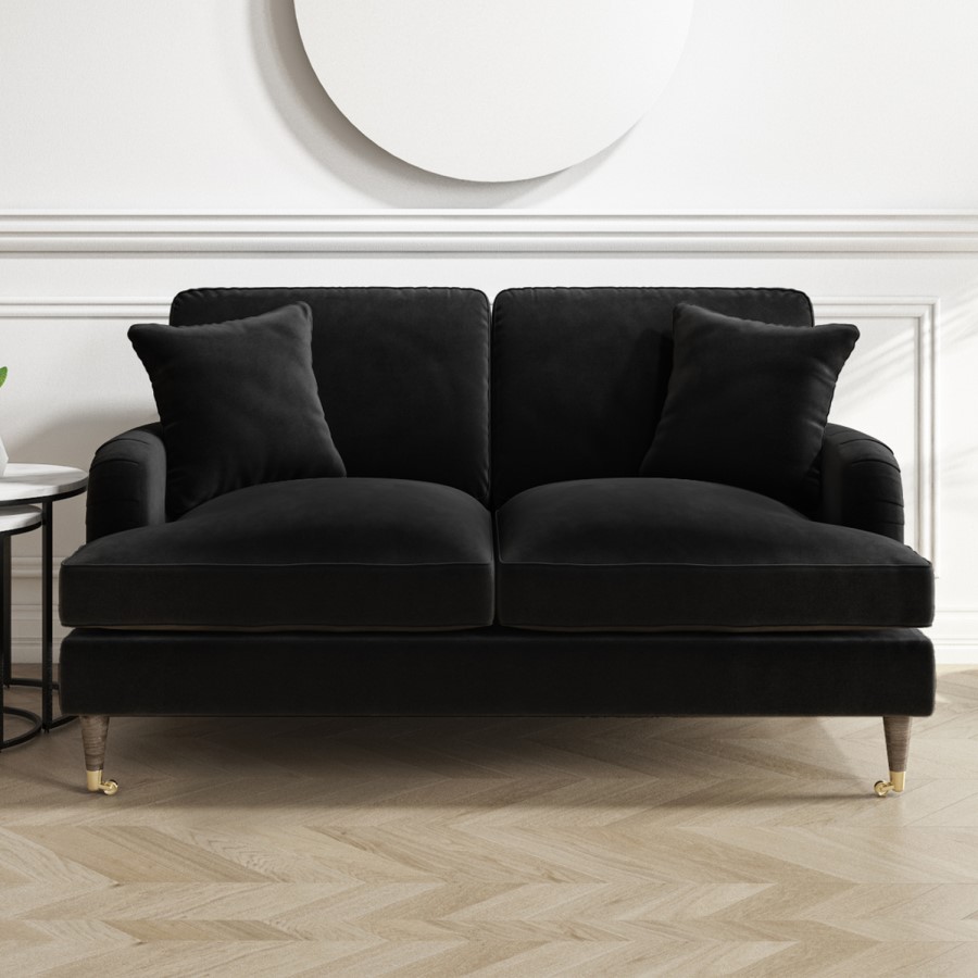 Discover maximum comfort and minimum maintenance with this gorgeous sofa. This plush Payton two-seater sofa offers traditional styling with a modern twist thanks to its dark wooden legs with gold accent front castors and classic ruched saddle arms. Beautifully tailored and upholstered in beautiful black velvet, it brings touch of elegance to your living space, making it the perfect statement piece. It comfortably seats two and comes accompanied with two matching throw cushions which add a final flourish of elegance.