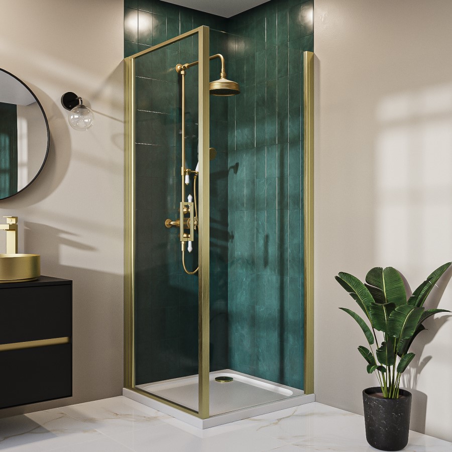 The Pavo square shower enclosure range is a great addition to your bathroom because it adds aesthetic with its brushed brass frame and practicality with its shape and features. It is available in a variety of sizes, colours, and with concealed fittings. Its single hinged door can be accessed easily, giving you the space you need. Matching perfectly with deep green and blue, this enclosure is sure to look beautiful in your home.