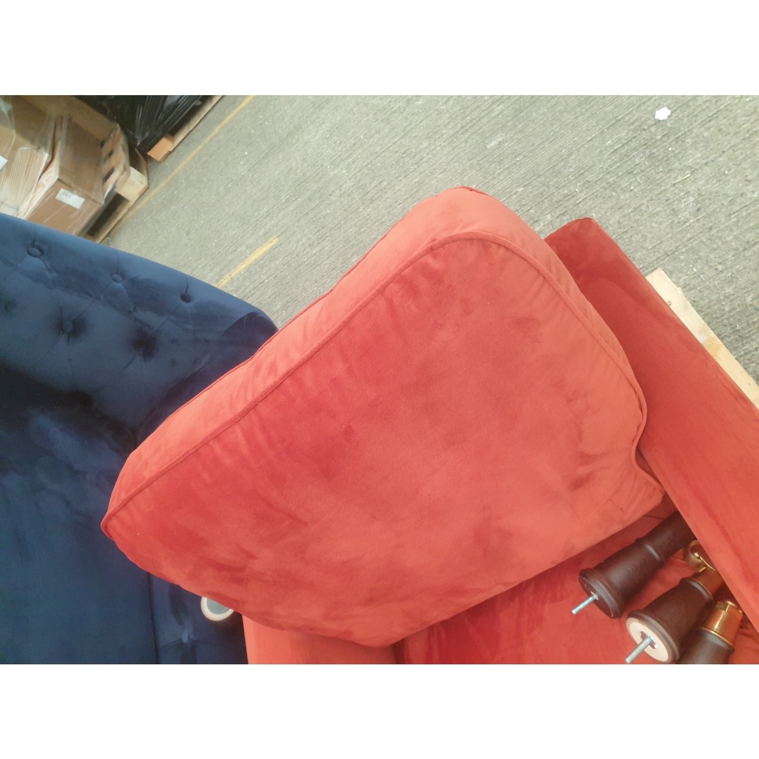 The Payton Burnt Orange Velvet Armchair have some minor cosmetic damage. The product has been cleaned. This will not stop the product from functioning. Please see the images for more information.