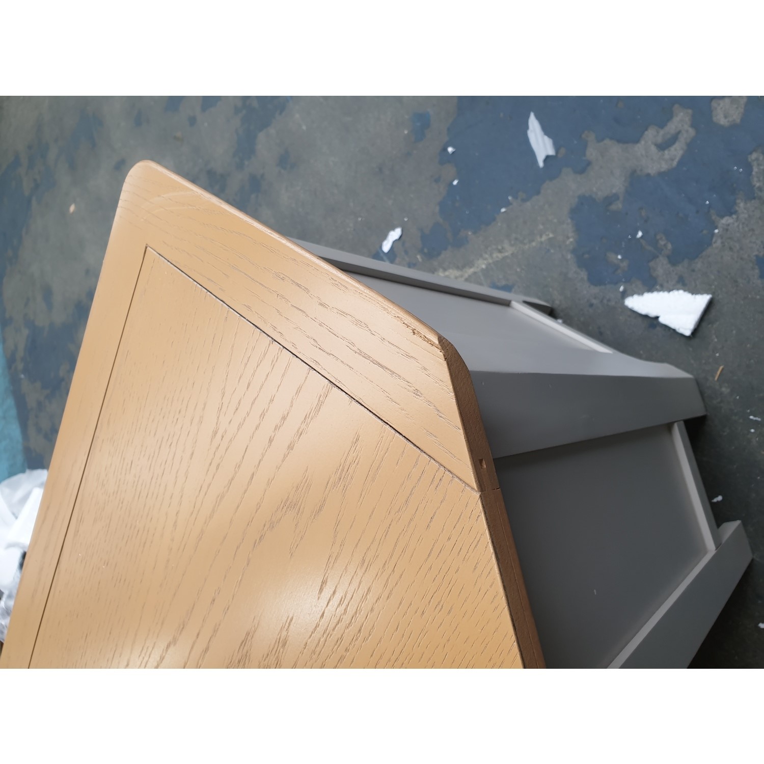 The Adeline Grey and Oak Corner TV Unit has some minor cosmetic damage. Two of the corners are slightly damaged. This will not stop the product from functioning. Please see the images for more information.