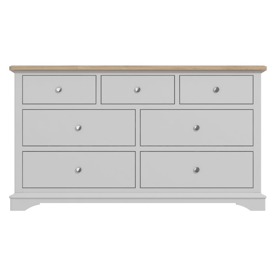 The Darley 4+3 wide chest of drawers has some minor cosmetic damage. There is a small chip internally to the unit and a slight impairment to a supporting panel. Damage does not affect functioning and will not be visible when in situe. Please see images for more information.