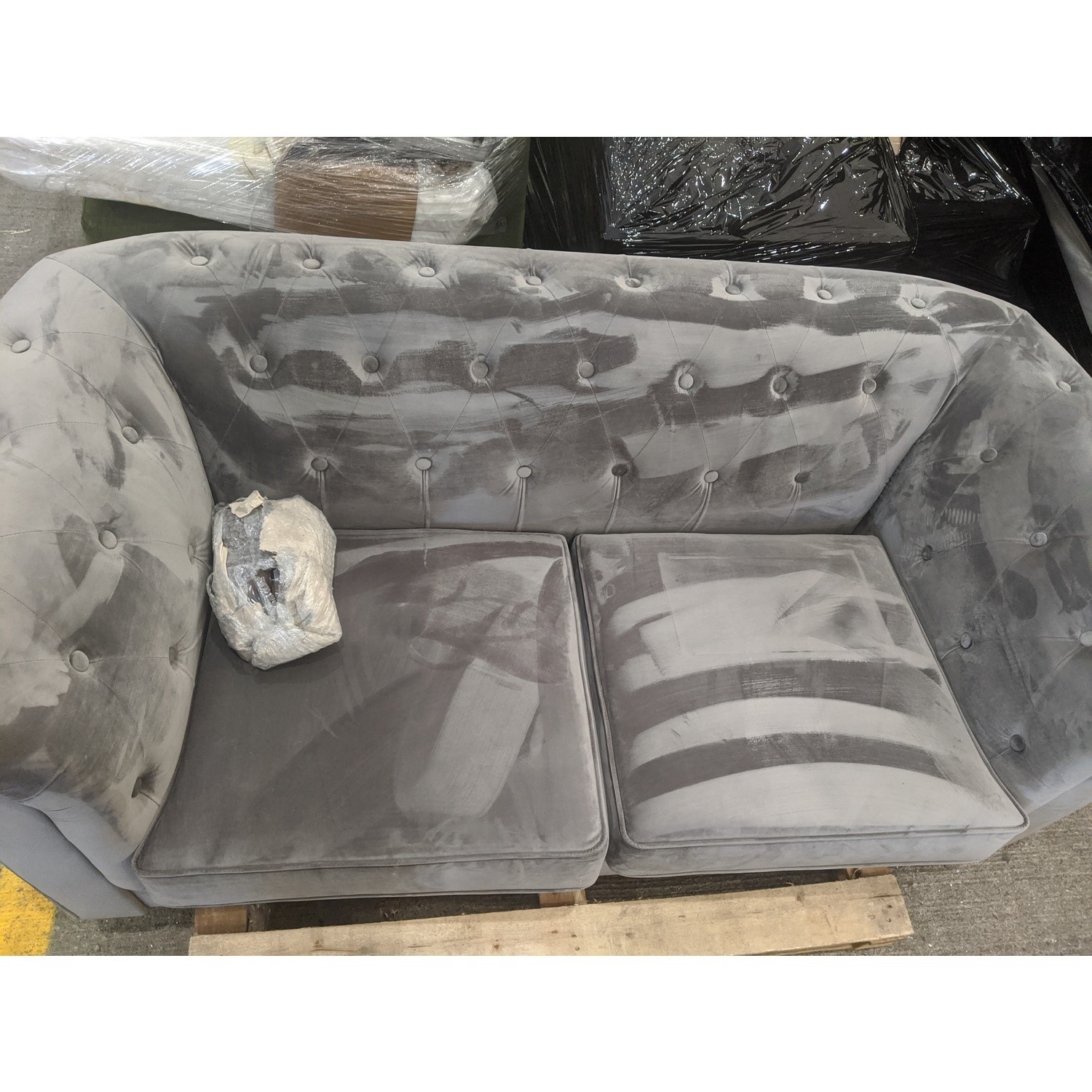The Bronte Grey Velvet 2 Seater Chesterfield Sofa have some minor cosmetic damage. It has been repaired, fixed buttons. This will not stop the product from functioning. Please see the images for more information.