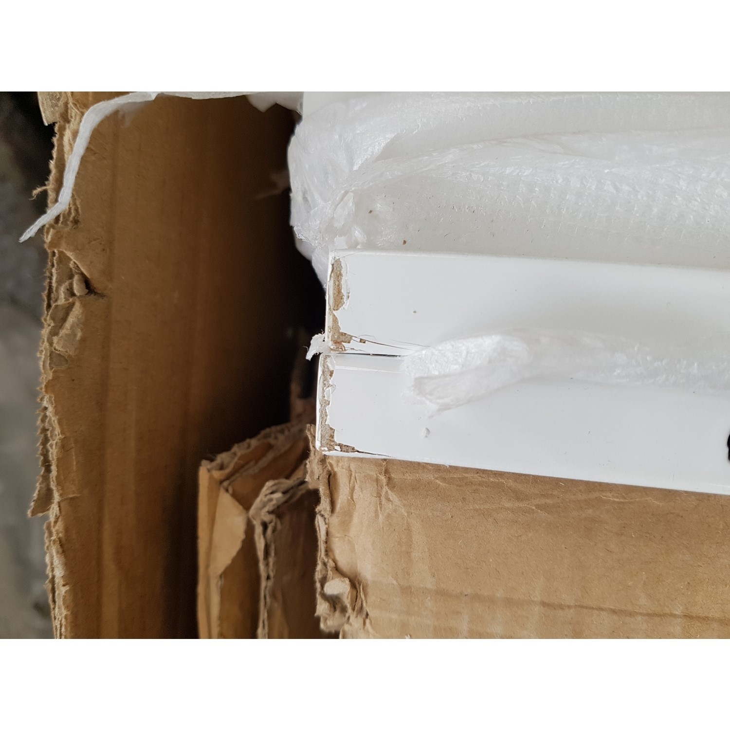 The Isabella White High Gloss Bedside has some minor cosmetic damage. The item's paint has chipped away at the corners. This will not stop the product from functioning. Please see the images for more information.