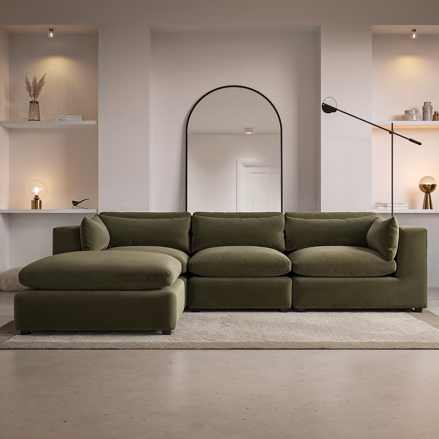 Perfect for a modern living room, the Hudson Khaki Green L-Shaped Sofa provides stylish seating for up to 4 people. The green velvet finish adds a pop of colour to your space whilst the plush, foam-filled cushions provide ultimate comfort, perfect for movie night! For added convenience, the cushions are completely removable which makes cleaning super easy. Built with a sturdy wooden frame, this sofa is made to last.