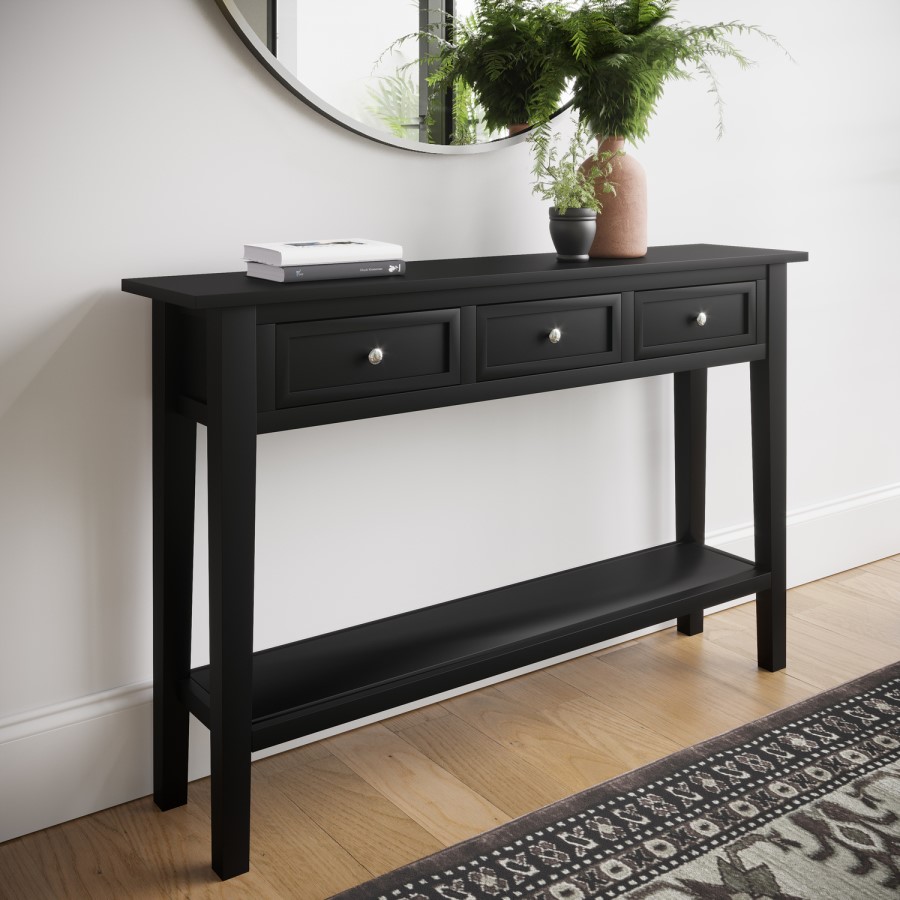 Maximise your space, and discover the perfect finishing touch for any hallway. This narrow console table has been beautifully finished in a sleek black with two options for your handles, to complement most room themes and colour palettes. Pick and choose how or where you store your items across three levels of convenient storage; on the top, concealed behind drawers or on the lower shelf. In your product's packaging, we provide 2 colour options for your 3 delicate handles. During assembly, you can choose between silver or gold, the perfect way to cater to any decor.