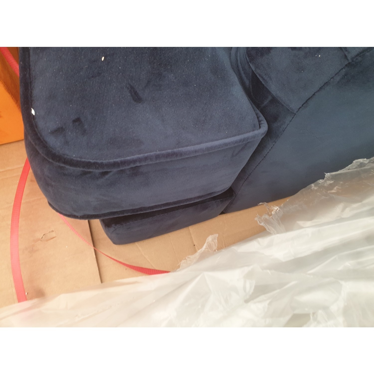 The Payton Navy Blue Velvet 2 Seater Sofa have some minor cosmetic damage. It has been repaired and cleaned. This will not stop the product from functioning. Please see the images for more information.