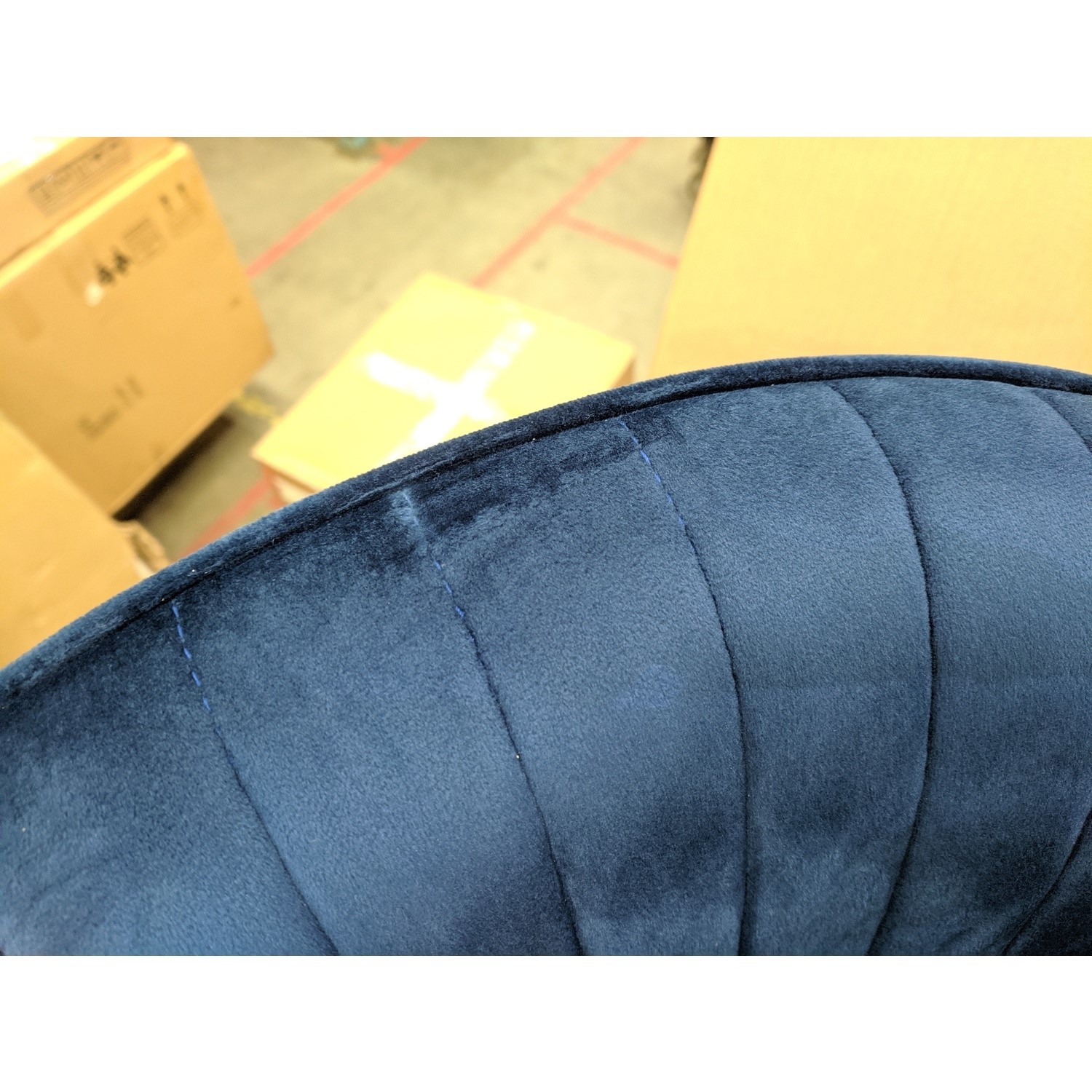 The Runa Navy Blue Velvet Adjustable Bar Stool with Curved Back have some minor cosmetic damage. It has scuff marks on the top front and back sides of chair. This will not stop the product from functioning. Please see the images for more information.