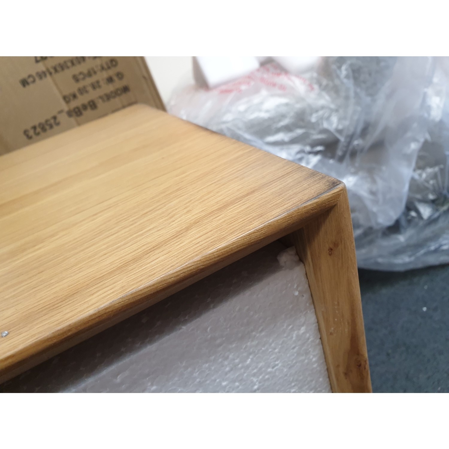 The Briana Oak Sideboard have some minor cosmetic damage. The joints at the lower corners has been repaired. This will not stop the product from functioning. Please see the images for more information.