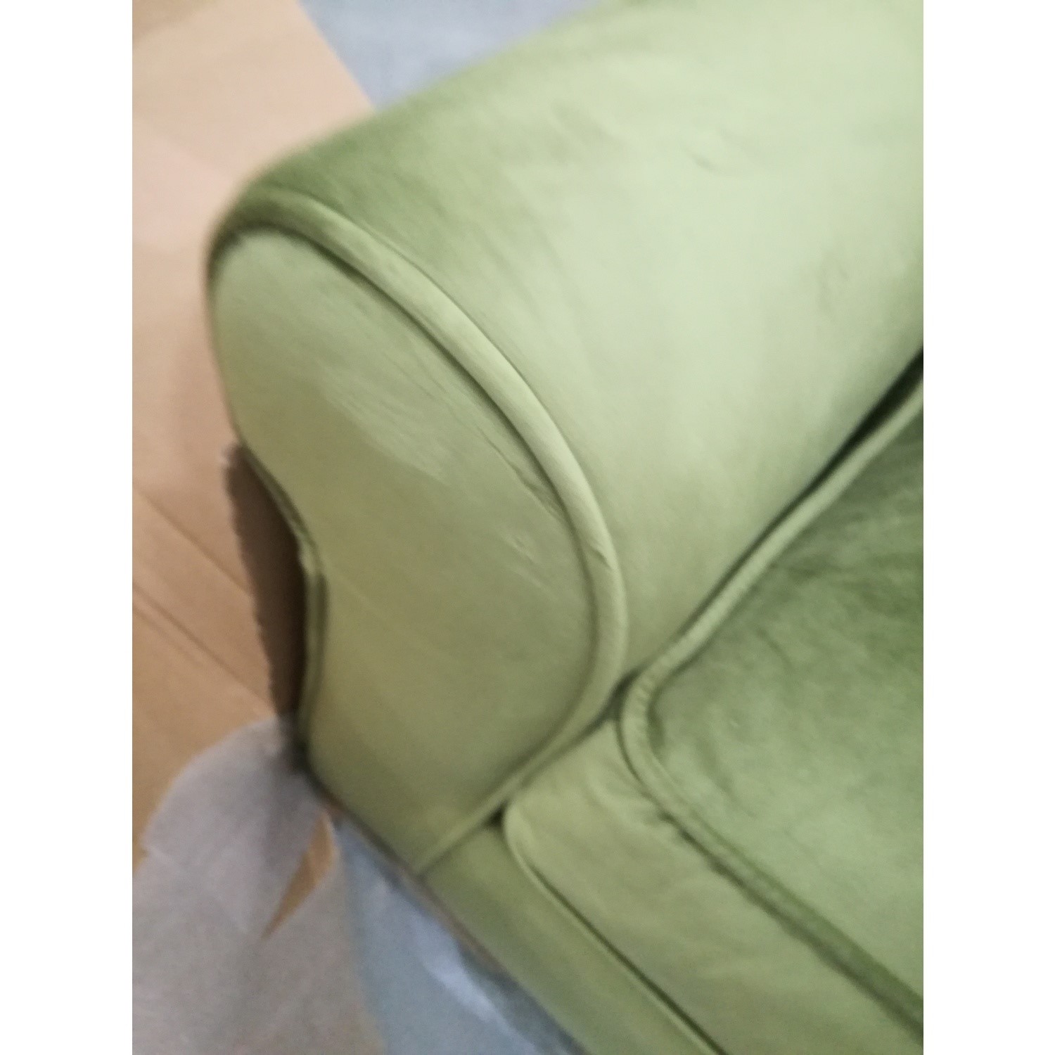 The Rupert Olive Green Velvet Wingback Armchair have some minor cosmetic damage. It has small marks on the arm rest and on the back rest. This will not stop the product from functioning. Please see the images for more information.