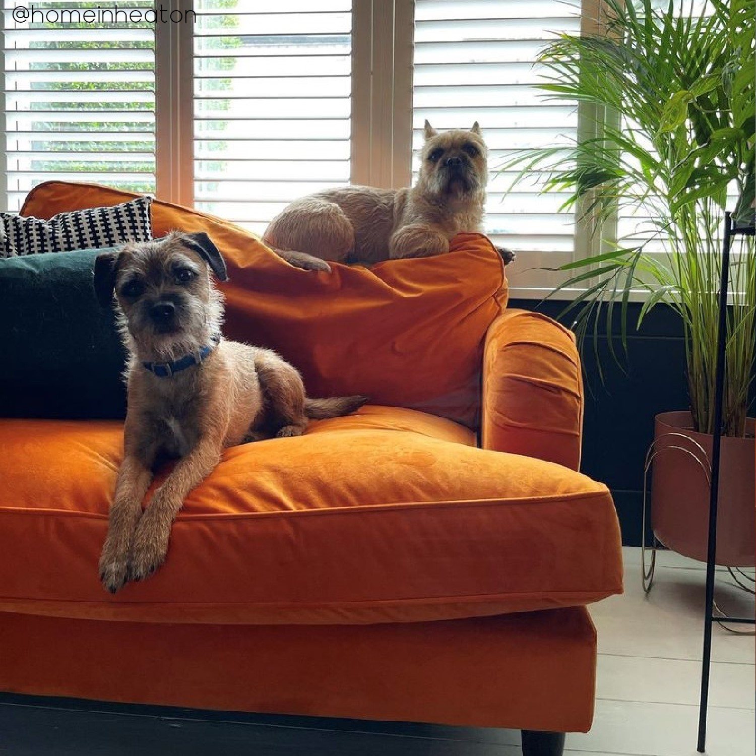 Discover maximum comfort and minimum maintenance with this gorgeous sofa. This plush Payton two-seater sofa offers traditional styling with a modern twist thanks to its dark wooden legs with gold accent front castors and classic ruched saddle arms. Beautifully tailored and upholstered in vibrant orange velvet, it brings a splash of colour to your living space, making it the perfect statement piece. It comfortably seats two and comes accompanied with two matching throw cushions which add a final flourish of elegance.