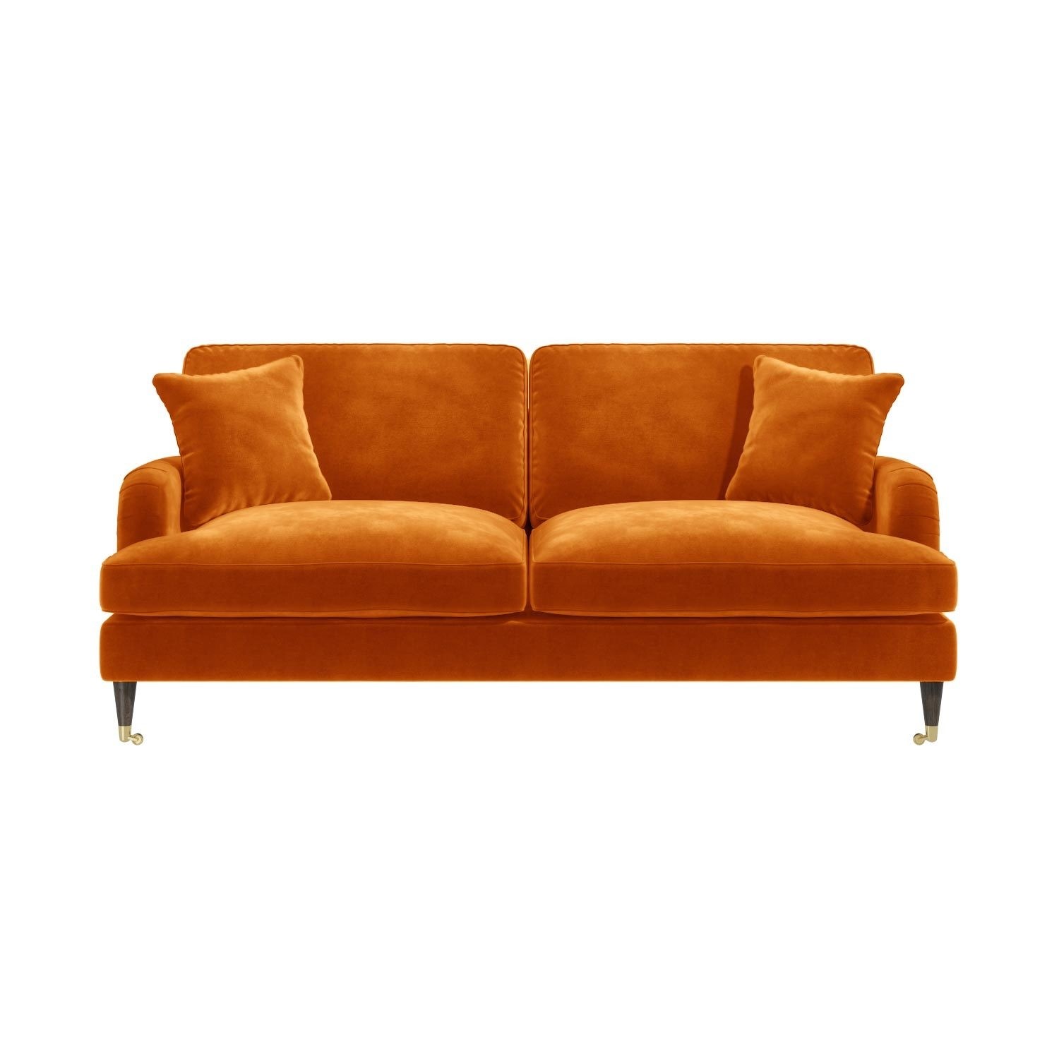 This traditional Payton sofa accommodates up to three people comfortably and includes two matching scatter cushions for added style and comfort. Classic ruched saddle arms and dark wood legs with gold castors complete the modern look. It’s built to last too, with a sturdy solid wood frame. Assembly is easy; simply fix the legs into position.