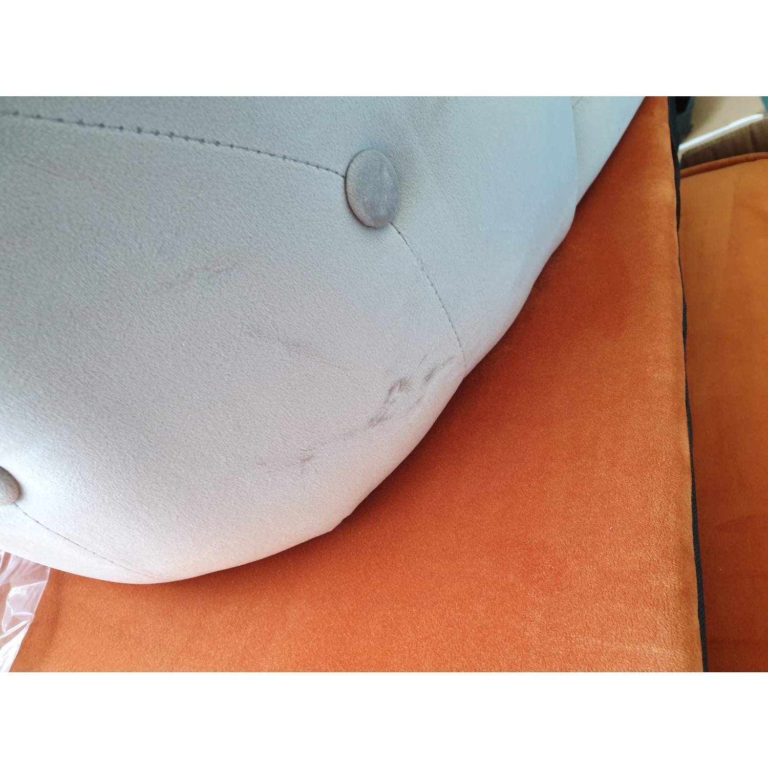 The Pair of Maddy Silver Grey Velvet Dining Chairs with Button Back has some minor cosmetic damage. Both of the chairs have marks on the front and back. This will not stop the product from functioning. Please see the images for more information.