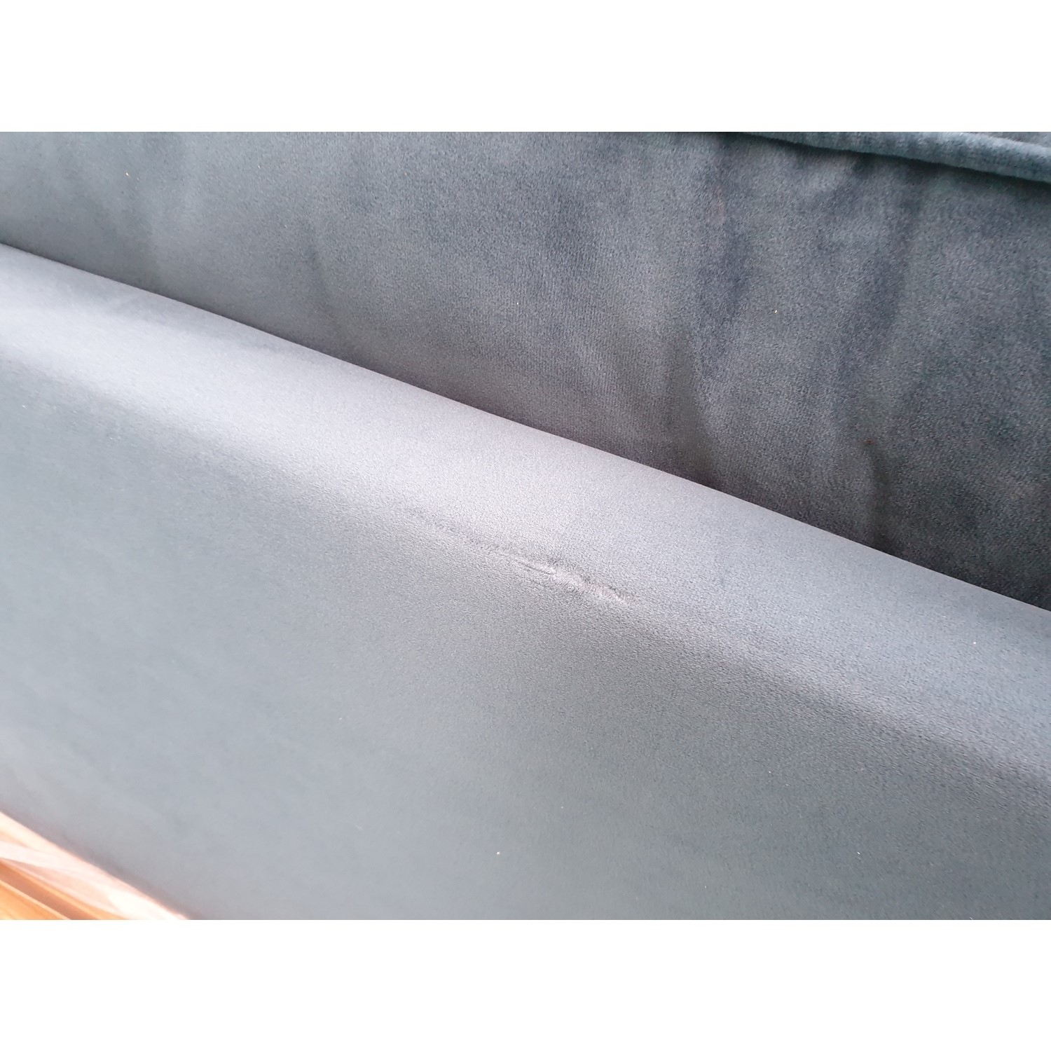 The Payton Teal Blue Velvet 3 Seater Sofa has some minor cosmetic damage. The cushion has a scuff mark and there are scuff marks on the top back side. This will not stop the product from functioning. Please see the images for more information.