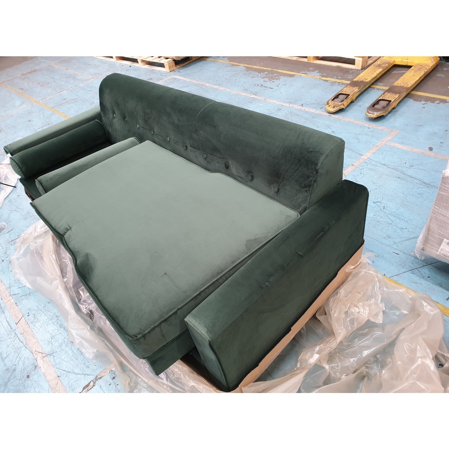 The Idris Right Hand Facing Dark Green Velvet Corner Sofa with Bolster Cushions has some minor cosmetic damage. There are strip band marks on the corner cushion and back of the sofa, there are scuff marks on the arms, scuff marks on the back top left handside and the fabric is ripped underneath. This will not stop the product from functioning. Please see the images for more information.