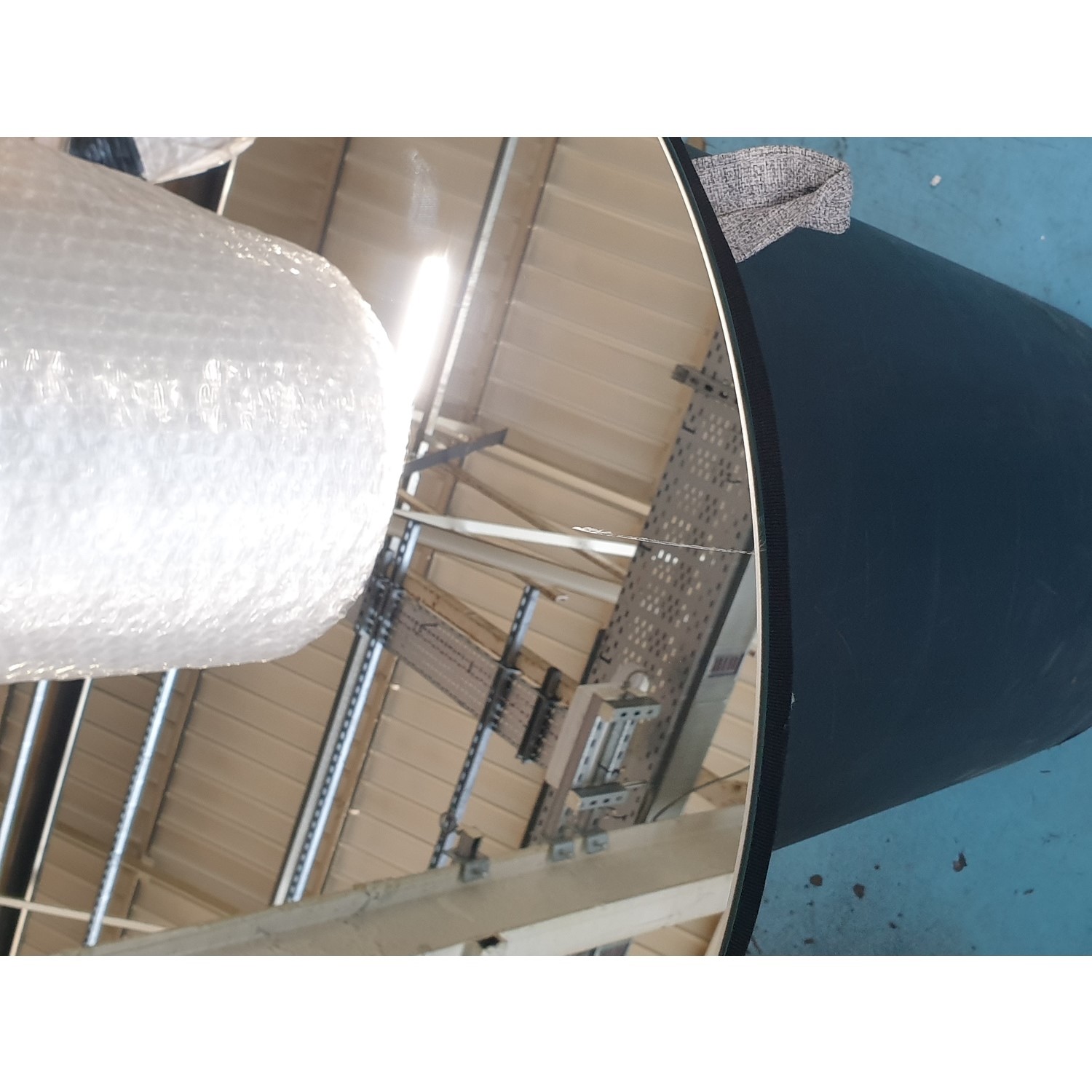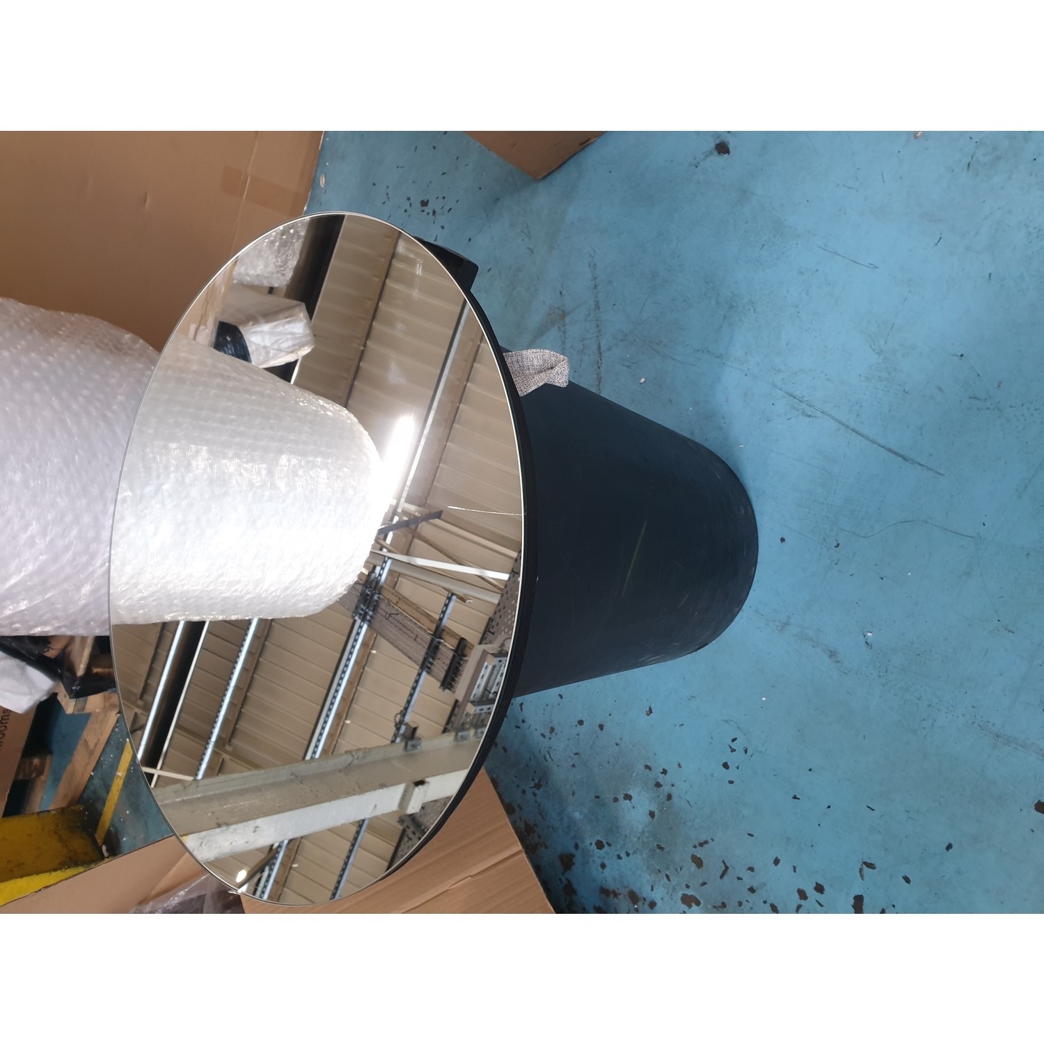 The Clio Round Grey Upholstered Ottoman Coffee Table has some minor cosmetic damage. There is scratch mark on the edge of the glass. This will not stop the product from functioning. Please see the images for more information.