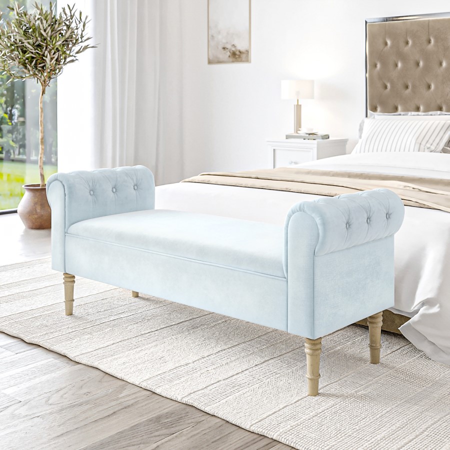 Delivering a touch of elegance and comfort to your bedroom with the quintessential Safina bench. The perfect place to lay out clothes to wear the following day or somewhere to rest after a long day at work, this versatile piece offers a touch of class to any bedroom. Its roll top armrest design with deep button detailing helps to make this the perfect place to sit for a minute or longer. Add to that a duck egg blue plush velvet and you're left with an extremely luxurious finish that offers comfort and an incredible treat for the eyes. Delicately carved wooden legs add to this piece's stunning appearance as well as adding a reliable durability, perfect for the busy home.