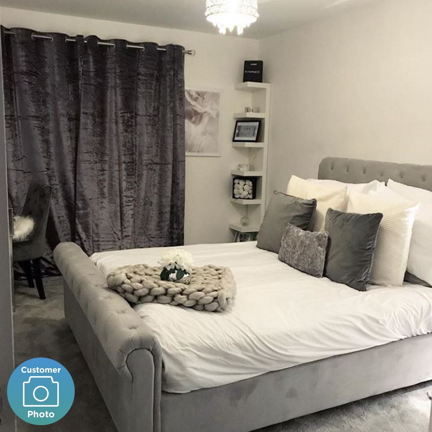 - Finish: Upholstered grey velvet