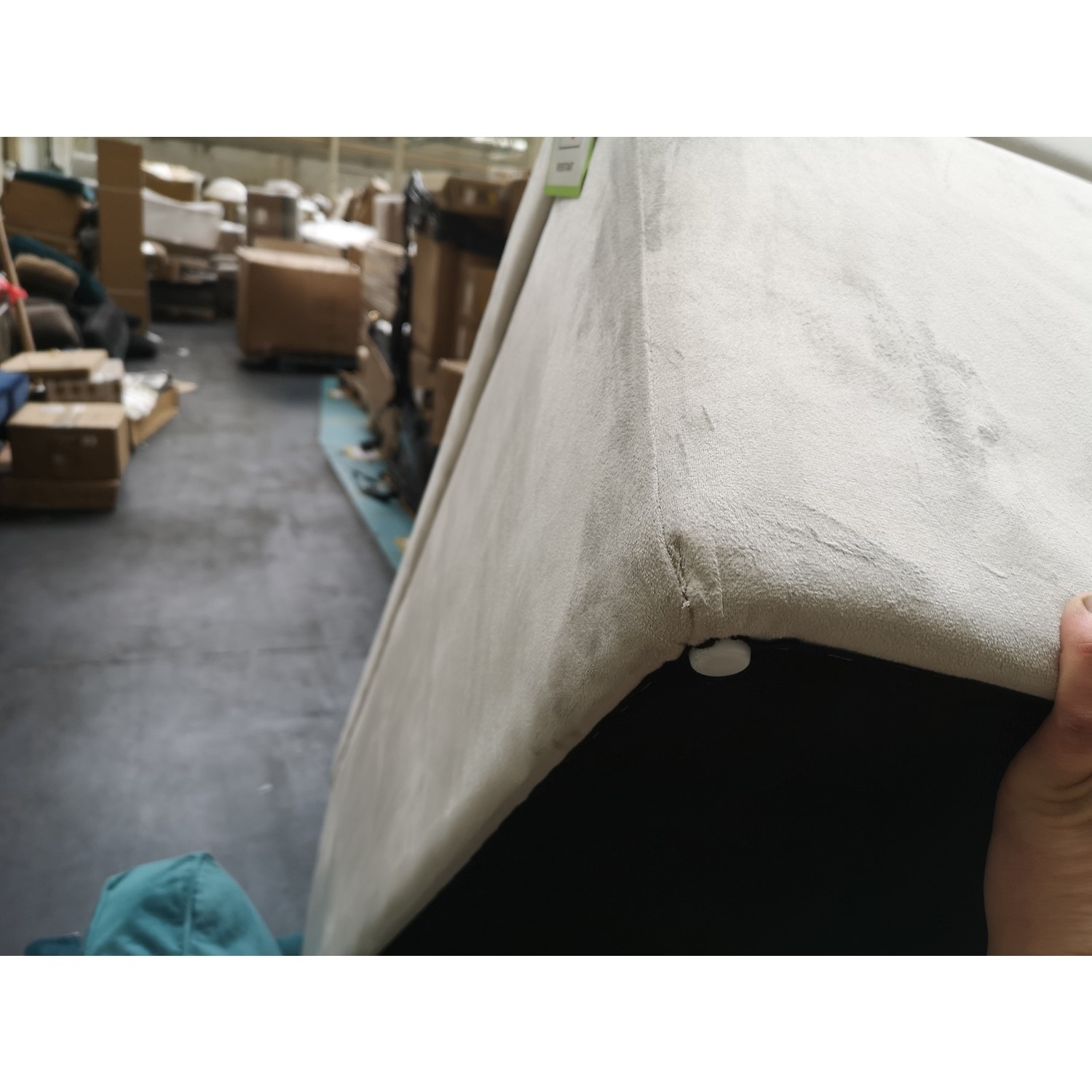 The Safina Velvet Storage Blanket Box in Silver Grey with Stud Detail has some minor cosmetic damage. The blanket box is ripped at the side and on the lower right back corner. This will not stop the product from functioning. Please see the images for more information.