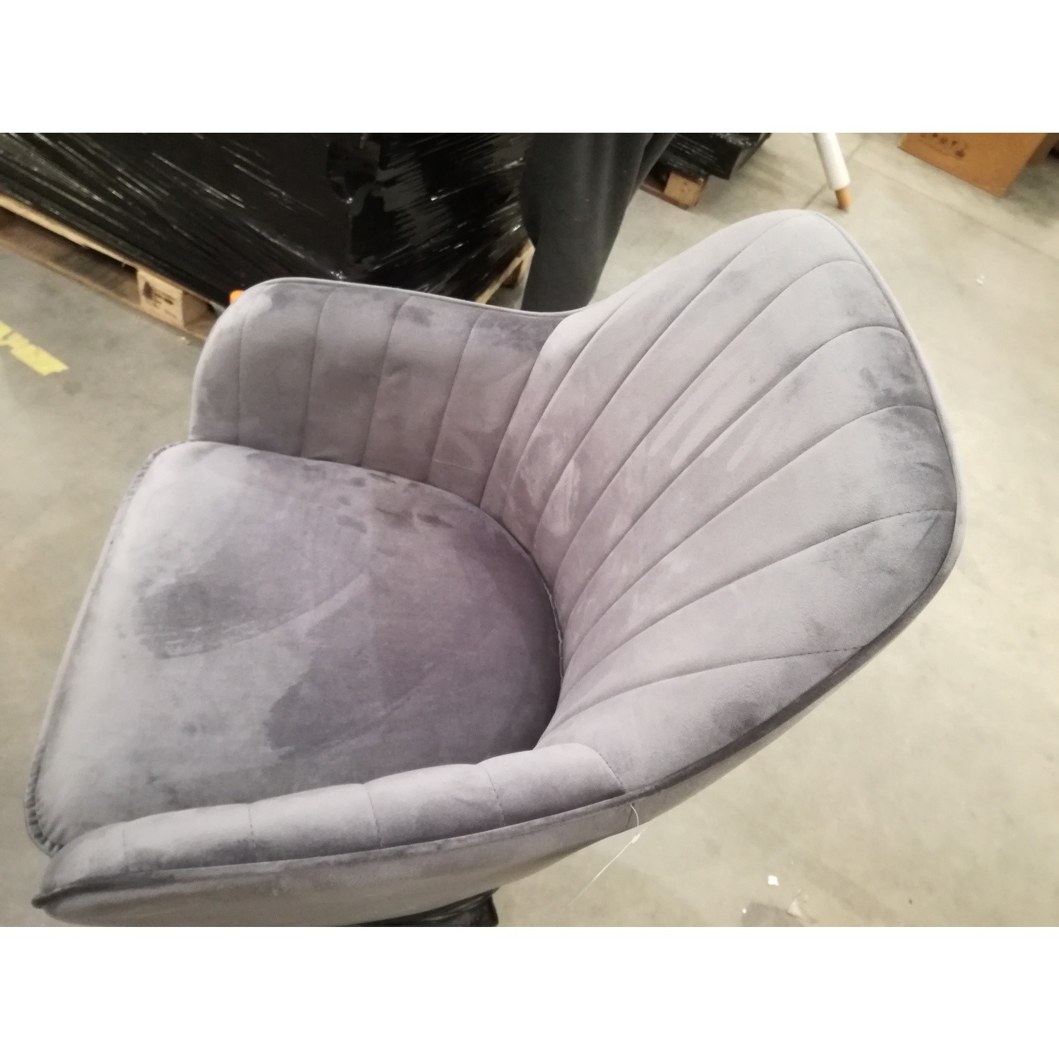 The Logan Set of 2 Grey Velvet Tub Dining Chairs have some minor cosmetic damage. One of the chair has some marks from the legs when transported. This will not stop the product from functioning. Please see the images for more information.