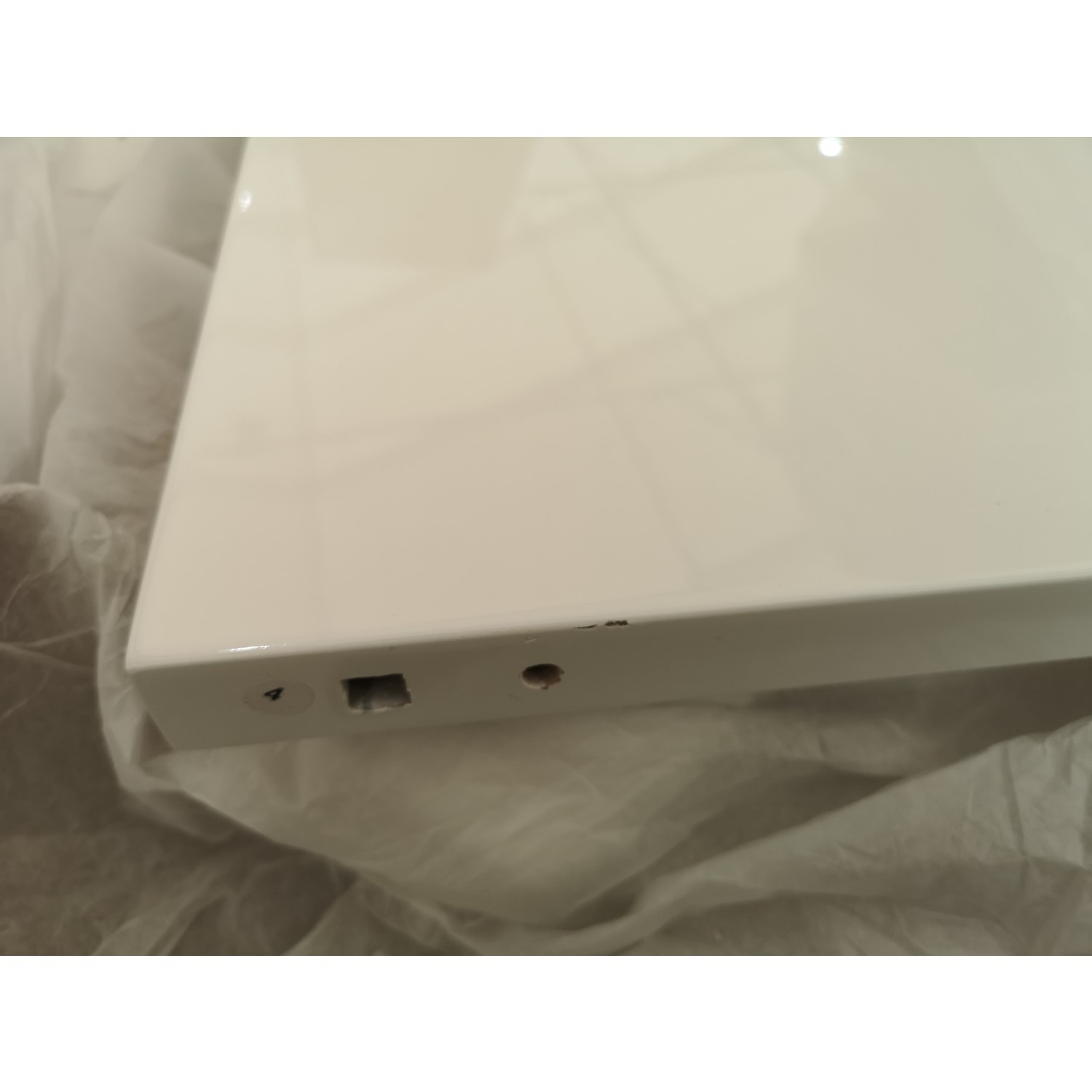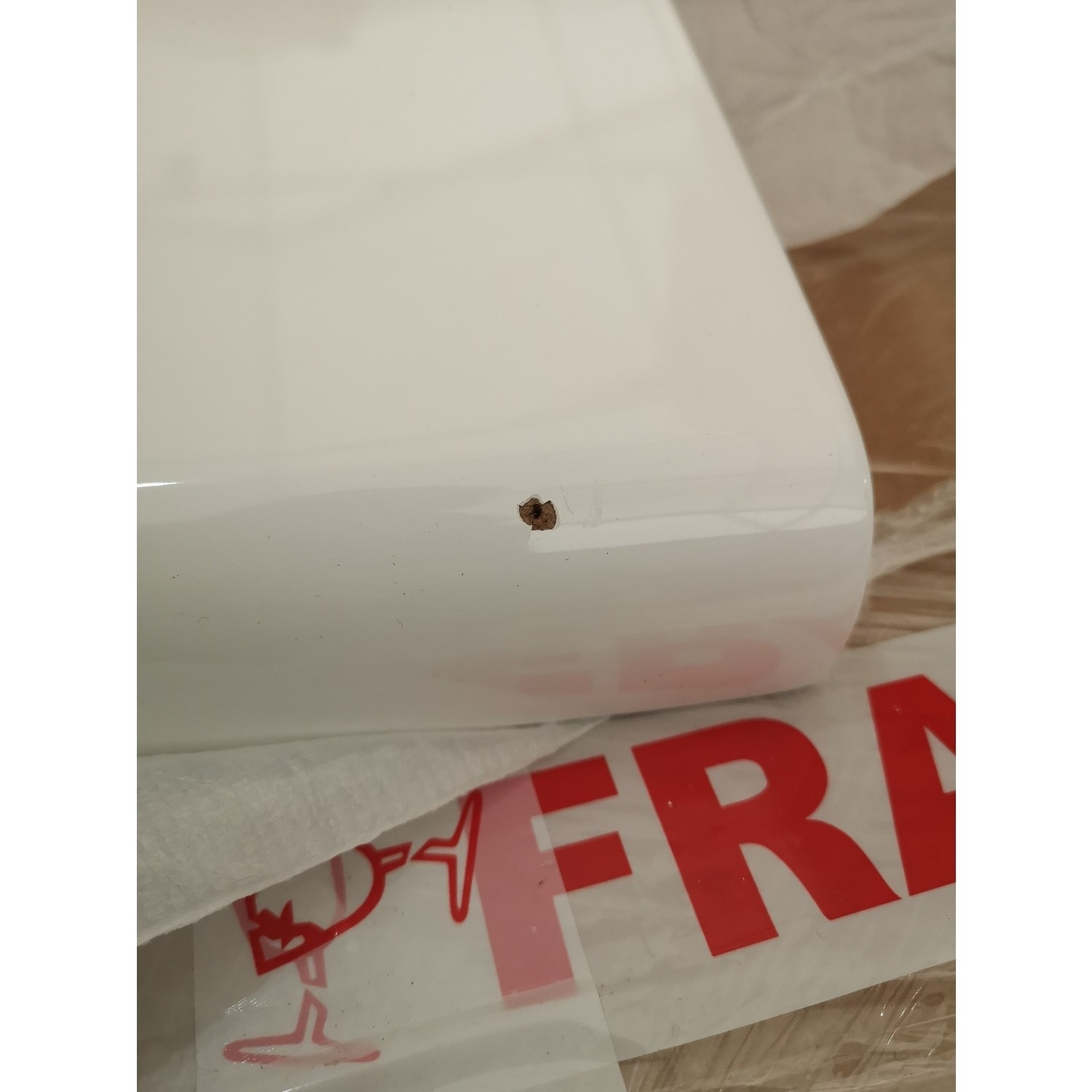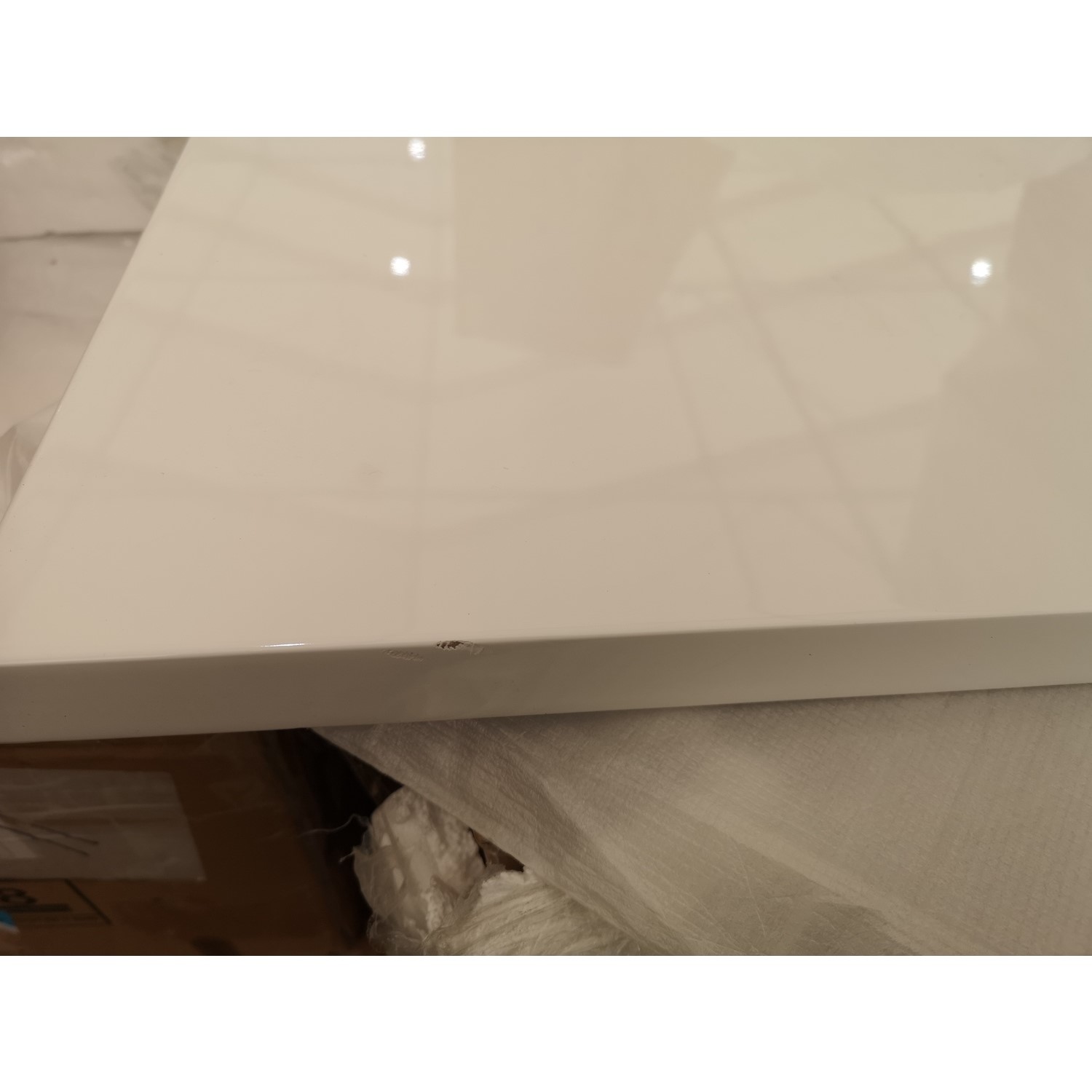 The Tiffany Set of 2 White Gloss Nesting Tables have some minor cosmetic damage. There is a small hole on one of the panels and two panels have chip marks. This will not stop the product from functioning. Please see the images for more information.