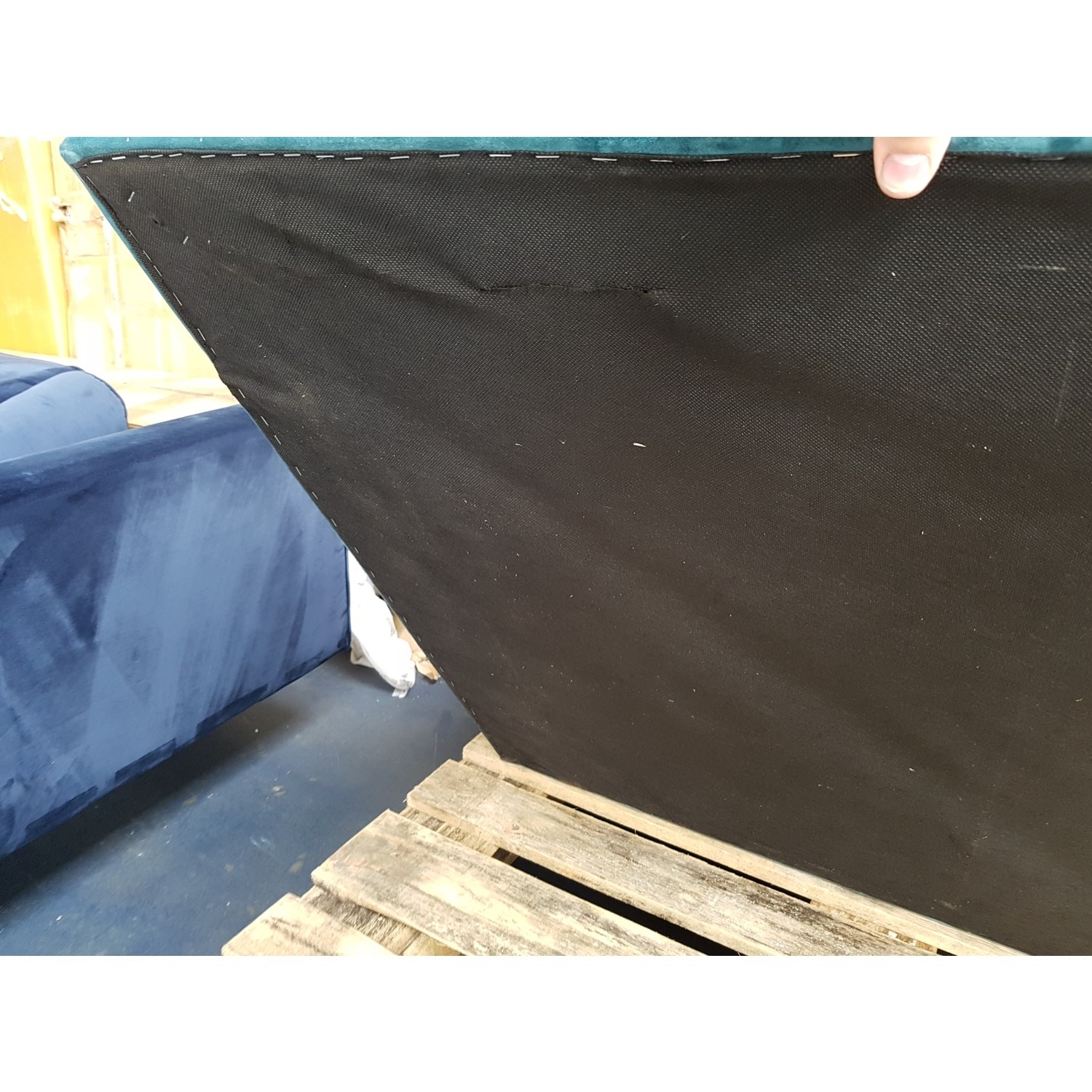 The Payton Teal Blue Velvet Loveseat Chairs has some minor cosmetic damage. There are a few marks on the sofa. There was also a rip in the back of the cushion and a rip underneath the seat, however this has now been repaired. This will not stop the product from functioning. Please see the images for more information.