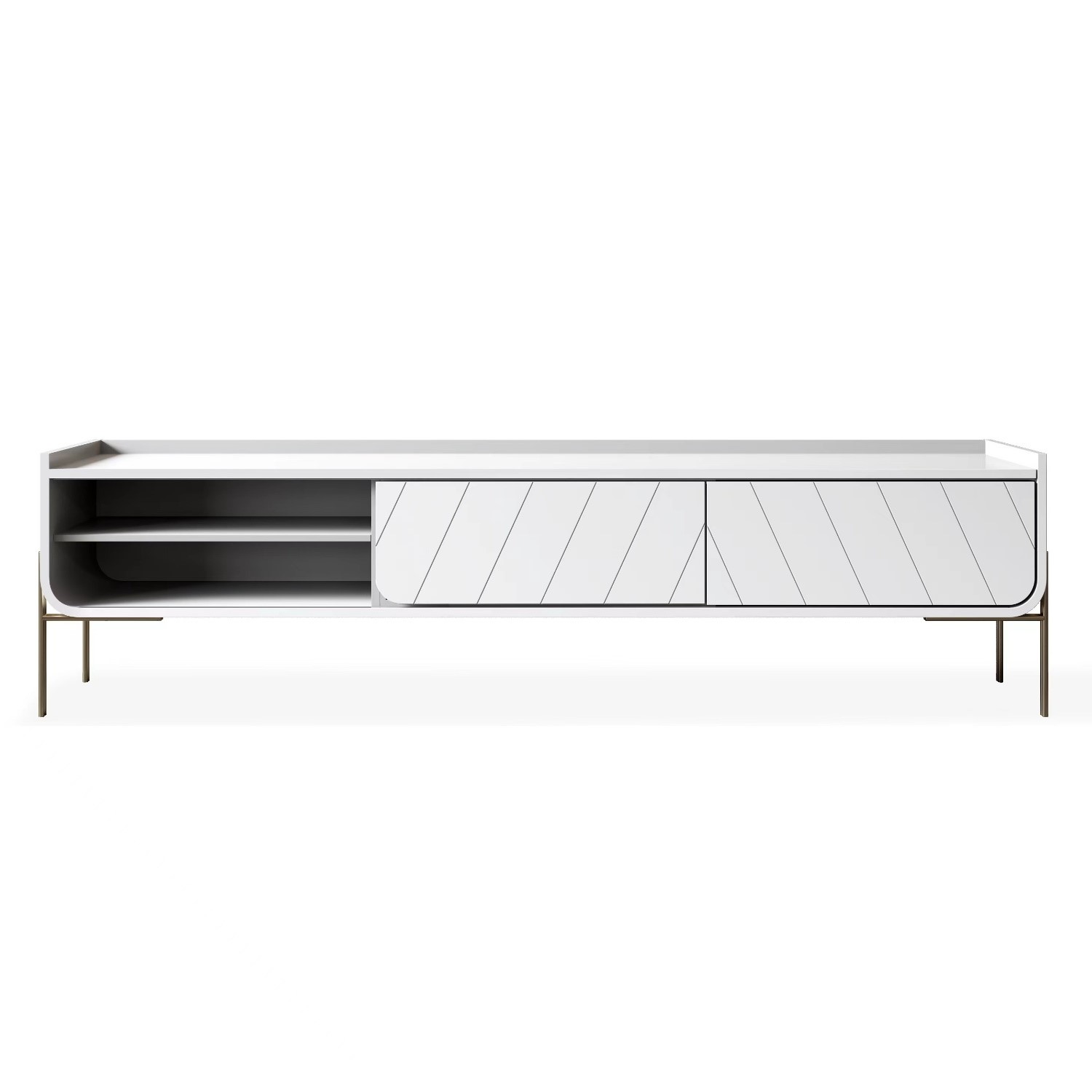 The Olis White and Gold Curved TV Unit have some minor cosmetic damage. There is a few cracks on back of unit. This will not stop the product from functioning. Please see the images for more information.