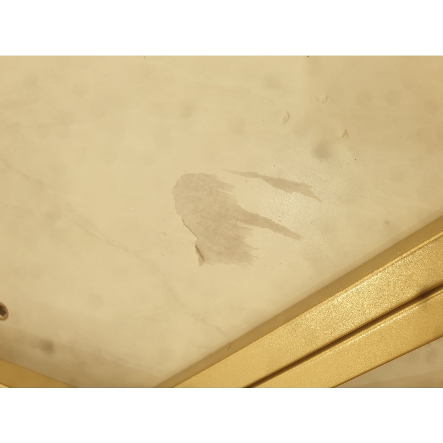 The Foster White Marble Hexagon Nest of 3 Tables have some minor cosmetic damage.One of the table top has paper ripped underneathside, metal bars marked. This will not stop the product from functioning. Please see the images for more information.