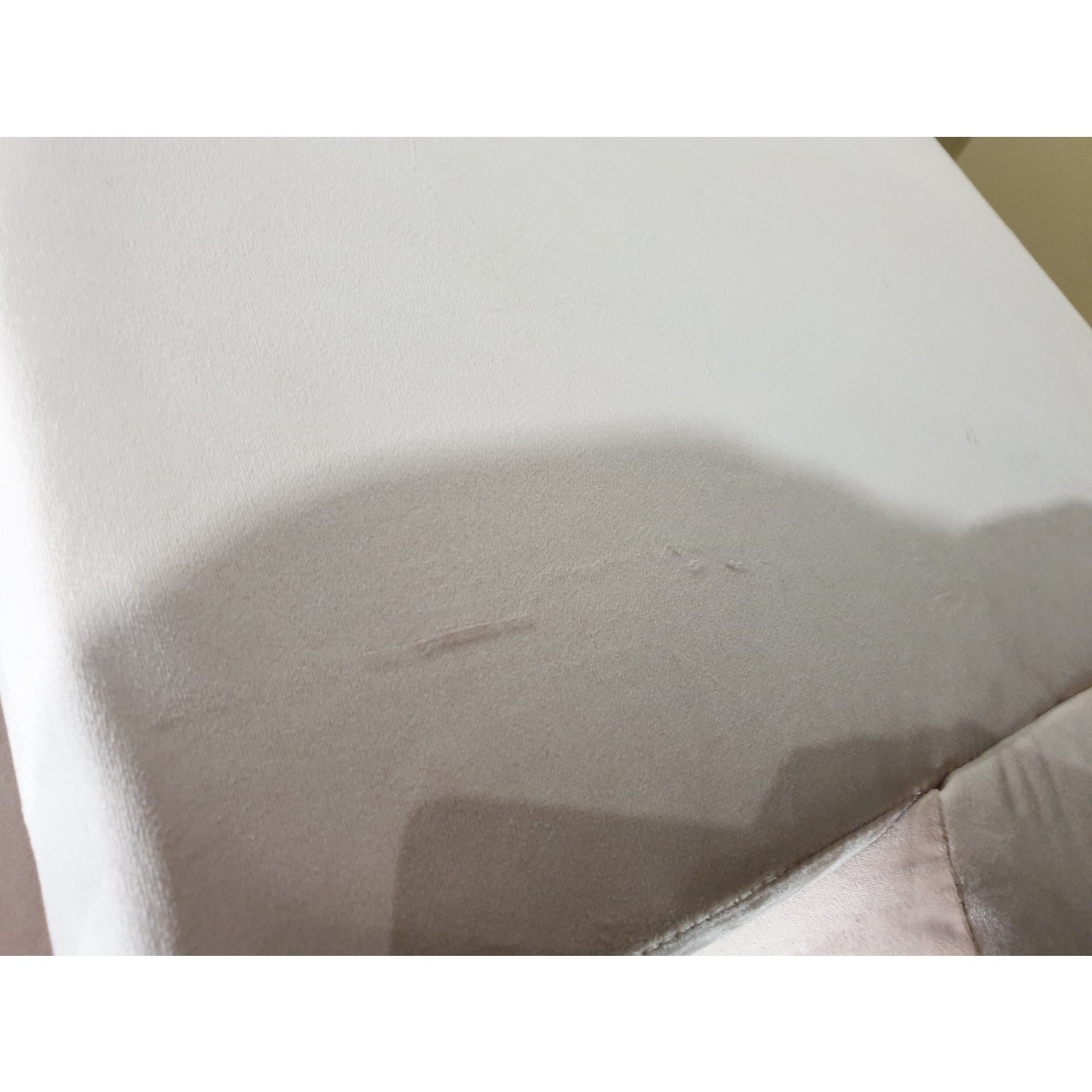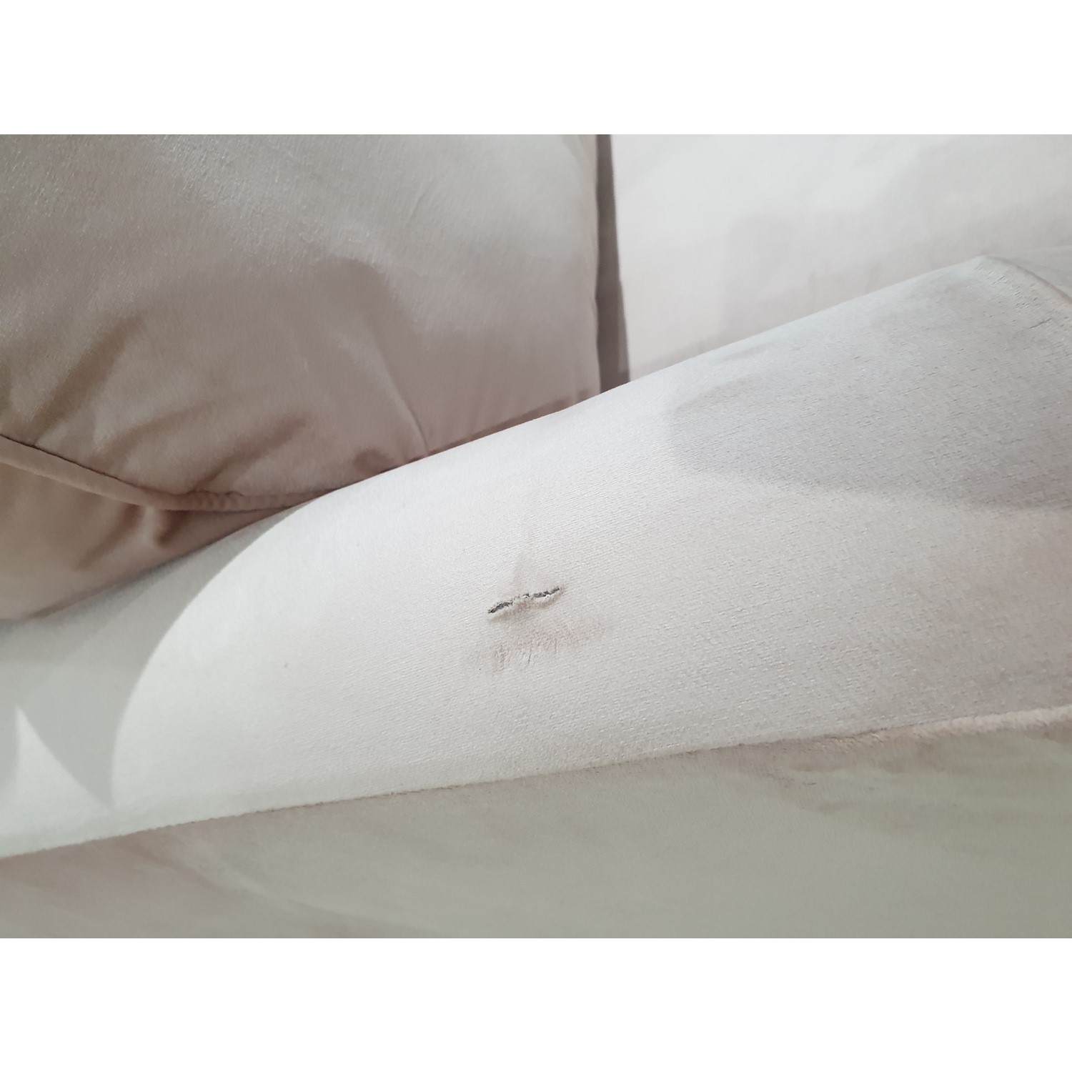 The Payton Light Pink Velvet Armchair has some minor cosmetic damage. There is a small hole on the right arm and the underneath fabric is torn. This will not stop the product from functioning. Please see the images for more information.