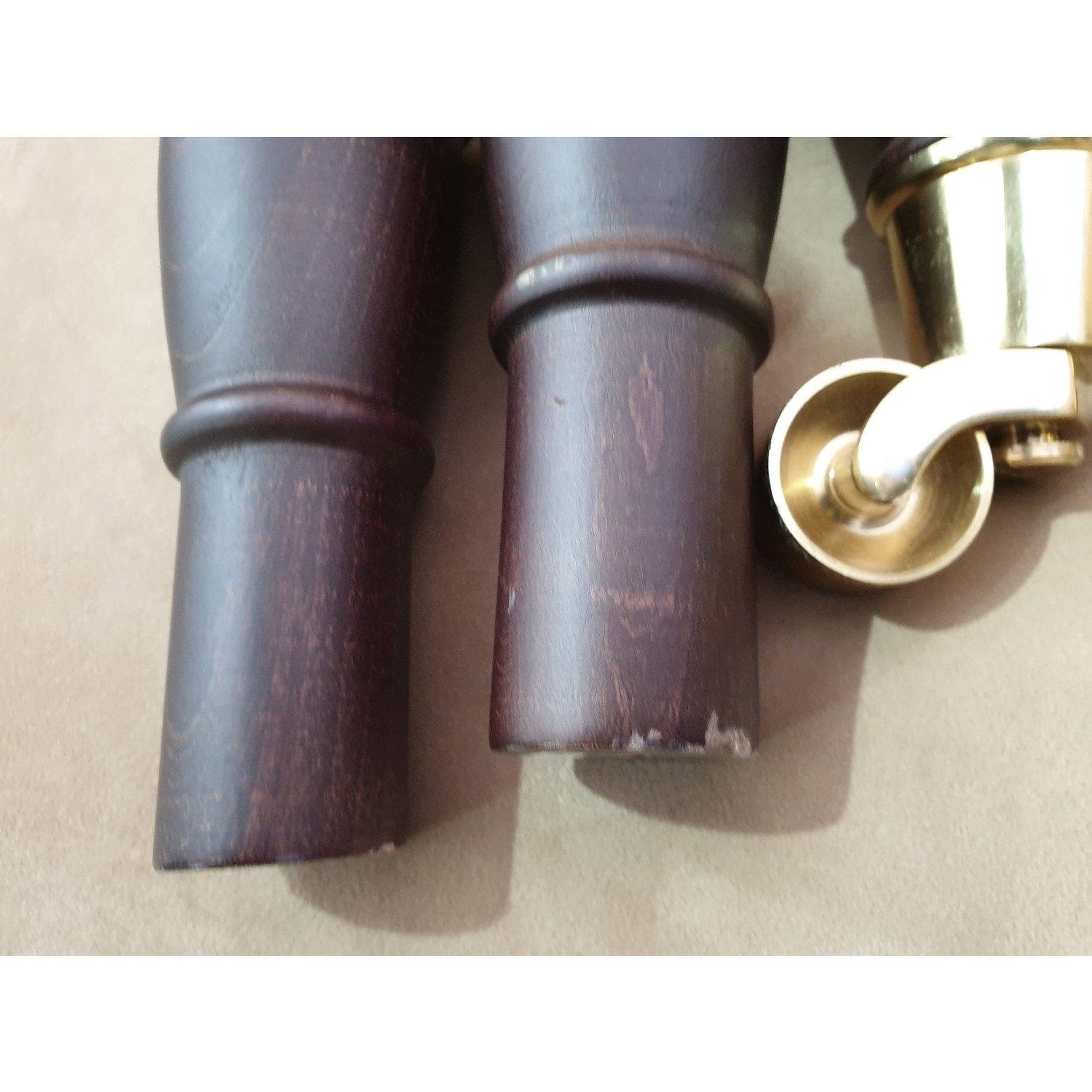 - Stylish dark wood legs with gold accent front castors for easy placement