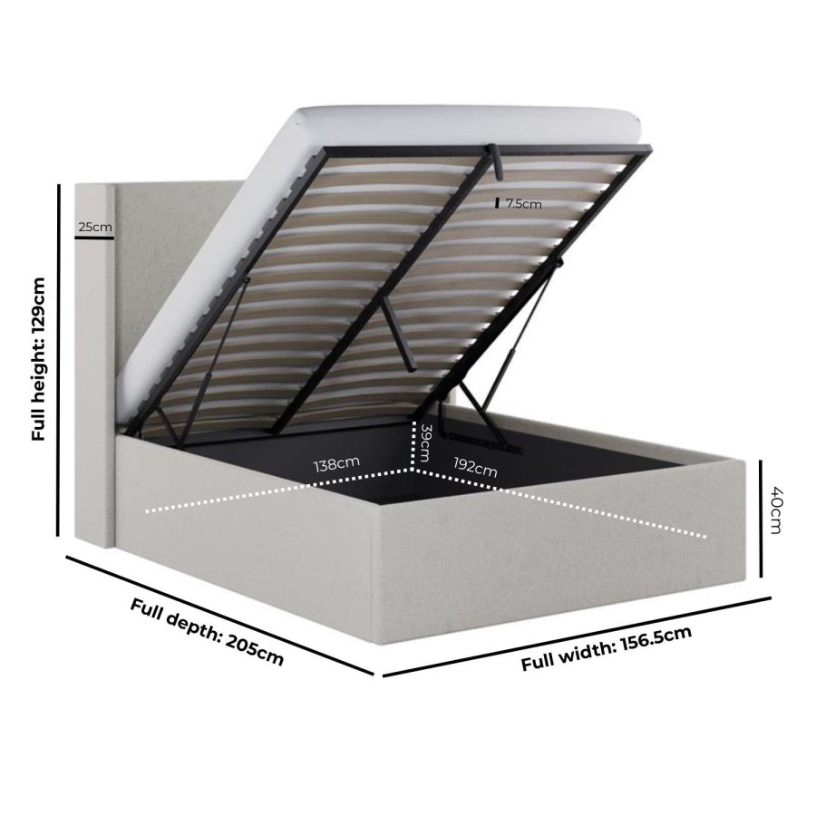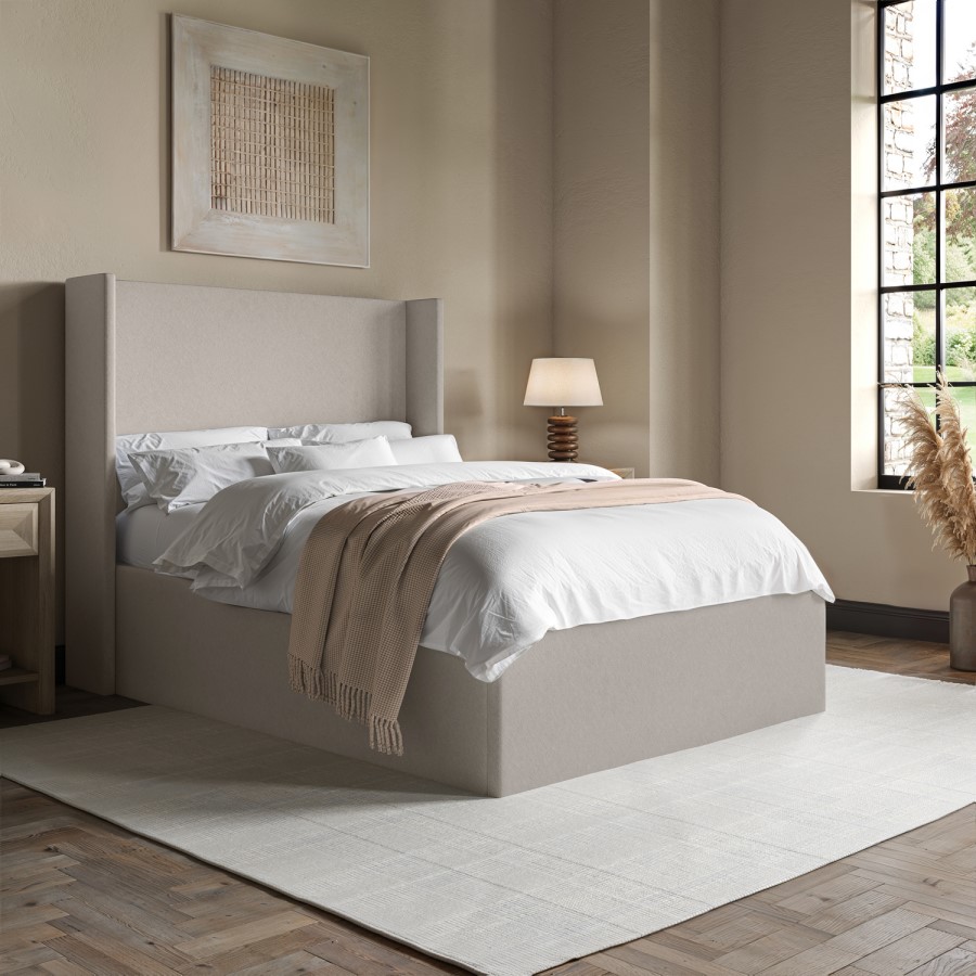 The Loxley Ottoman Bed is the ultimate blend of minimalist design and everyday practicality. Upholstered in luxurious, neutral greige chenille, it brings a soft, modern elegance that suits any decor style. The tall padded wingback headboard provides both comfort and a sophisticated focal point, while the smooth gas-lift mechanism reveals a spacious fabric-lined ottoman storage base, ideal for keeping your room clutter-free and your belongings neatly protected. It features a sprung slatted base for flexible mattress support and improved airflow, providing a cooler, more comfortable sleep. This bed is designed to fit a UK standard double-size mattress, which is not included, allowing you the freedom to pair it with a mattress of your choice.