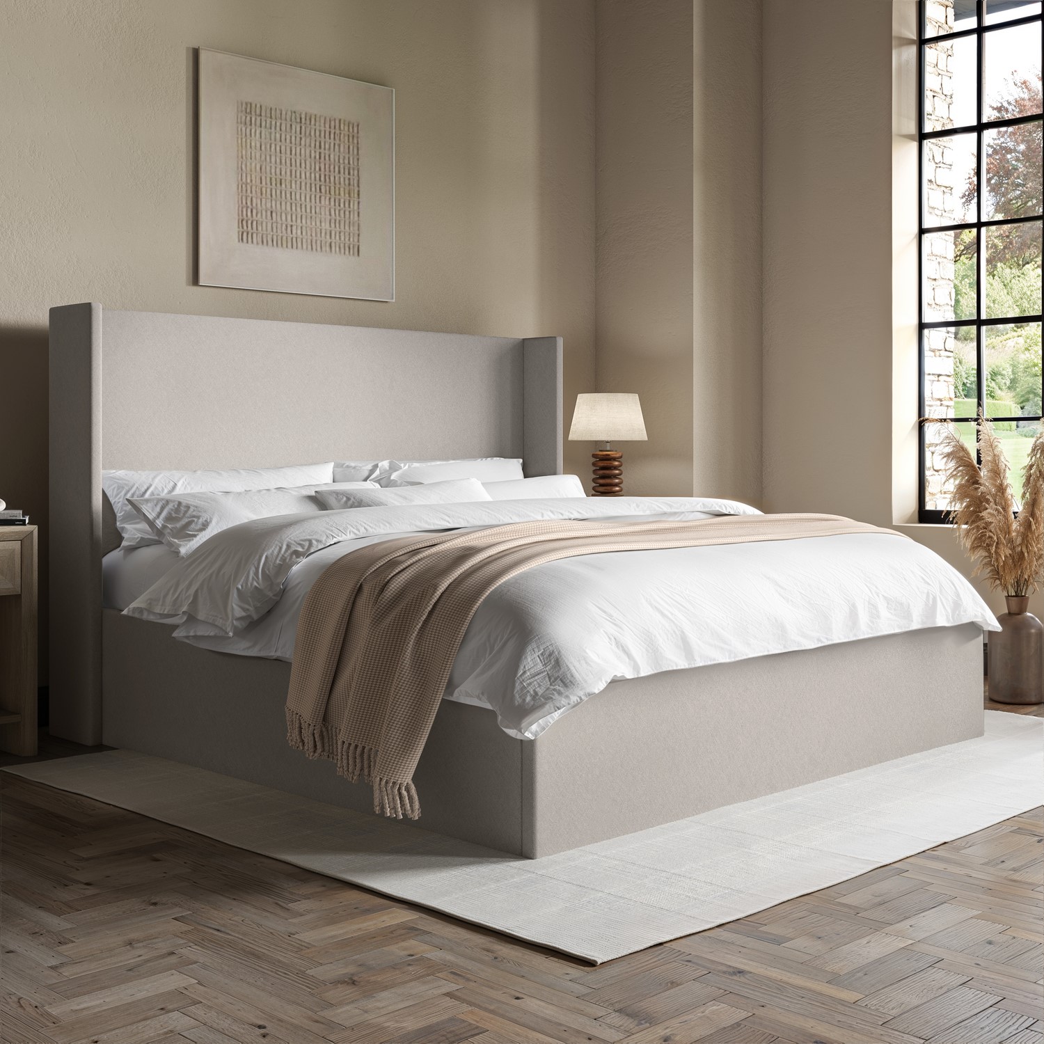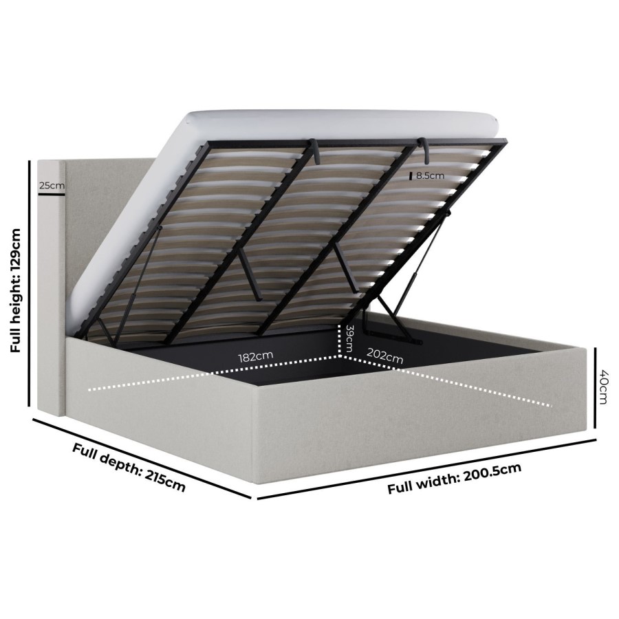 The Loxley Ottoman Bed is the ultimate blend of minimalist design and everyday practicality. Upholstered in luxurious, neutral greige chenille, it brings a soft, modern elegance that suits any decor style. The tall padded wingback headboard provides both comfort and a sophisticated focal point, while the smooth gas-lift mechanism reveals a spacious fabric-lined ottoman storage base, ideal for keeping your room clutter-free and your belongings neatly protected. It features a sprung slatted base for flexible mattress support and improved airflow, providing a cooler, more comfortable sleep. This bed is designed to fit a UK standard super king mattress, which is not included, allowing you the freedom to pair it with a mattress of your choice.