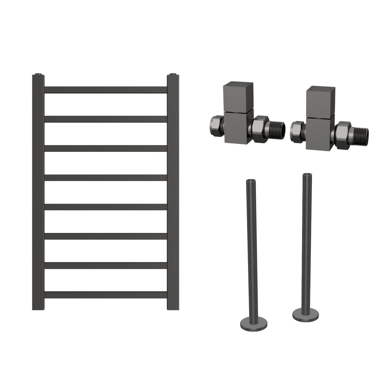 Crafted from high-quality steel, this towel radiator is built to endure humid environments. Its anti-rust and anti-corrosion properties boost durability, while the excellent heat conduction guarantees lasting warmth. Easy to clean and low maintenance, it’s a smart and elegant solution for both heating and towel storage. The matching brushed gunmetal grey pipe cover kit is perfect for hiding unsightly copper pipes between the floor and your radiator valves. The straight manual radiator valves have a cross-head design that brings modern charm to any bathroom.