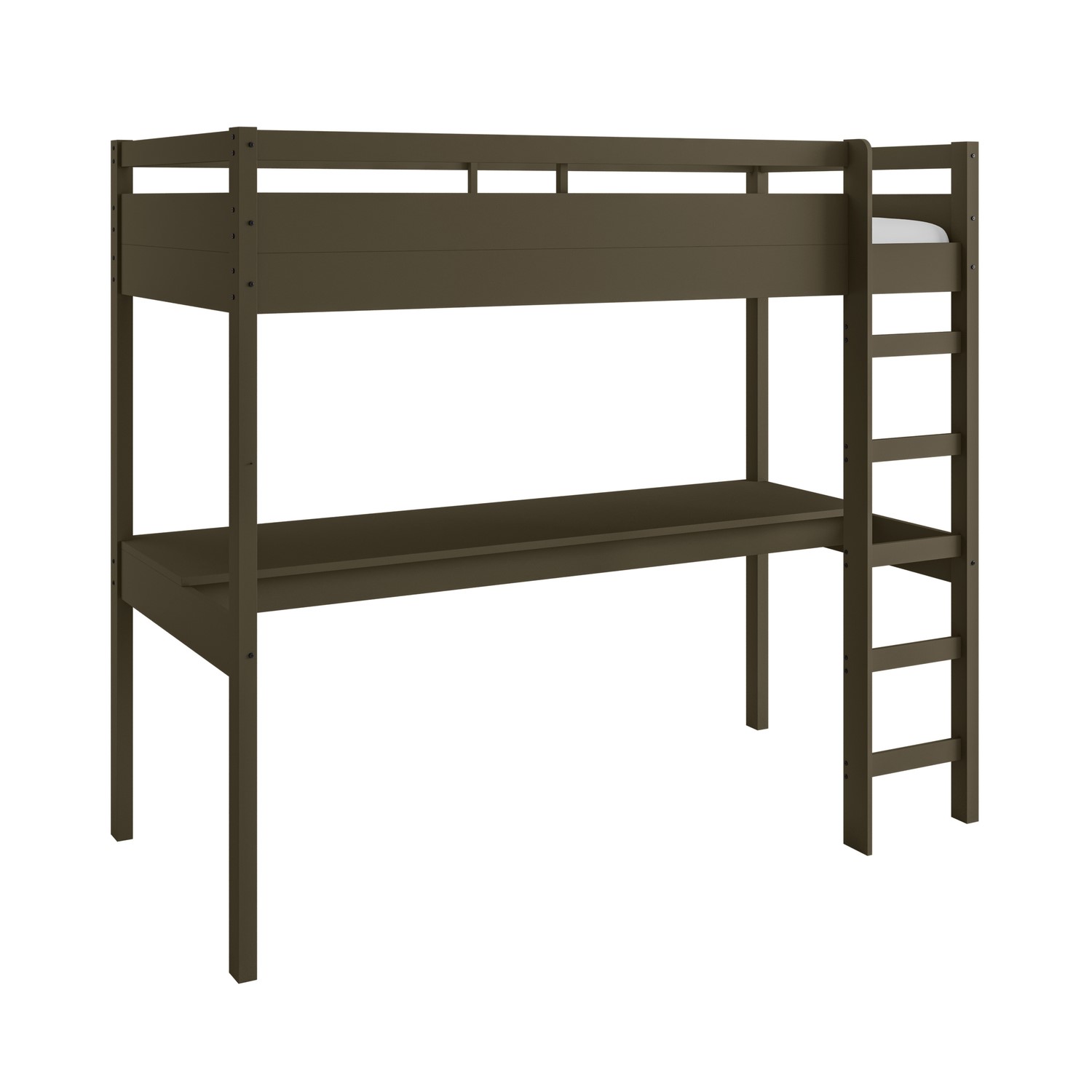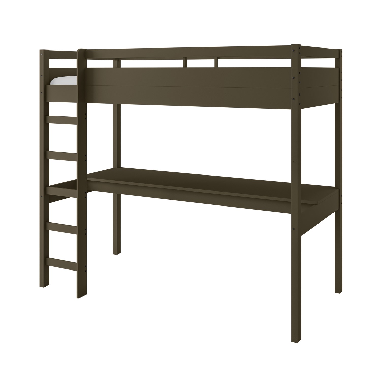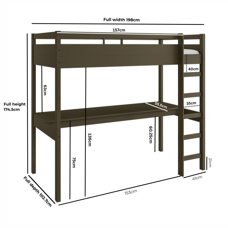 This Wyatt high sleeper bed finished in a rich dark olive green for a modern aesthetic. It features a full-width desk beneath for both studying and gaming, providing ample space to accommodate large-scale monitors, gaming PC and accessories. This bed is crafted from safe and sturdy solid pine to offer a secure space to sleep and chill, and the ladder can be positioned on either the left or right side, offering flexibility for various room layouts.