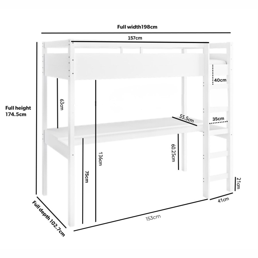 This Wyatt high sleeper bed finished in a sleek white for a timeless look. It features a full-width desk beneath for both studying and gaming, providing ample space to accommodate multiple screens, PC tower and accessories. This bed is crafted from safe and sturdy solid pine to offer a secure space to sleep and chill, and the ladder can be positioned on either the left or right side, offering flexibility for various room layouts.