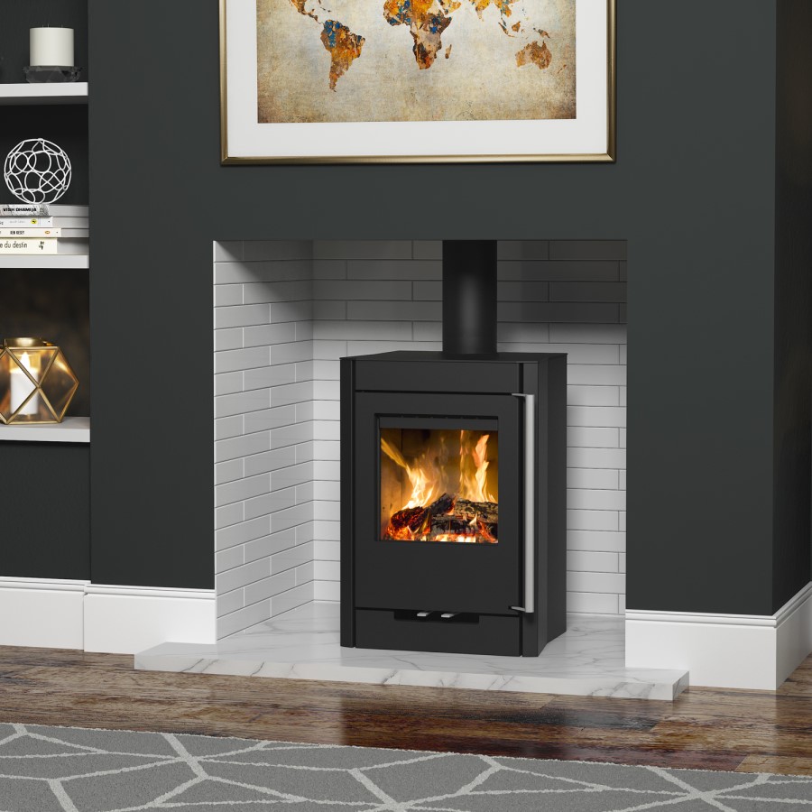 The Flare By Be Modern Hotspur suite features a freestanding woodboring stove. Finished in a painted matt black with a generous 5KW heat output. Featuring a large viewing widow with a strong air wash that helps keep the glass clear. This suite also has an 82% efficiency with the latest ultra green combustion technology which helps keep the emissions low and compliant with eco-design standards effective in 2022. Great for those looking for powerful heating performance without compromising on style.